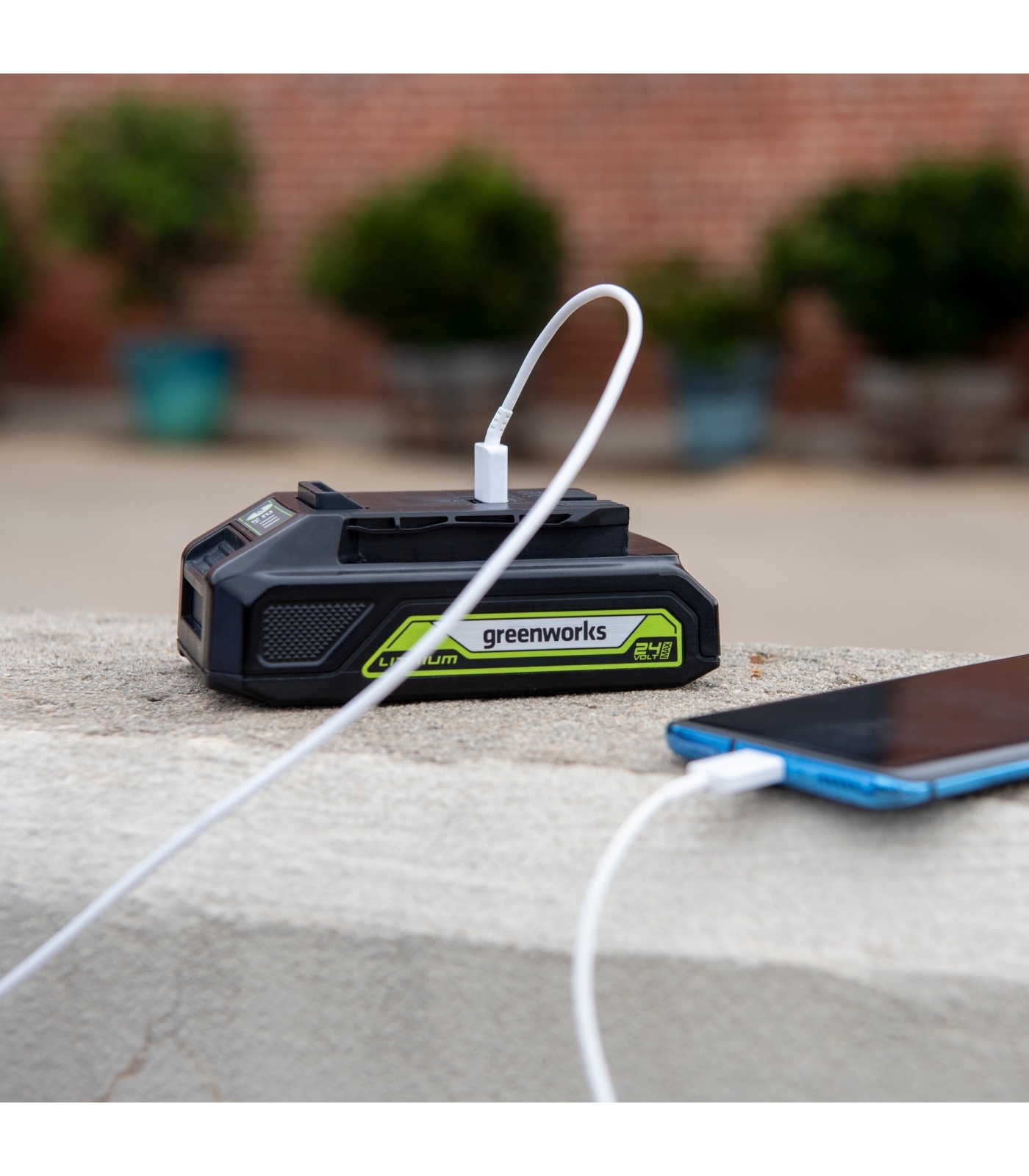 Универсальная аккумуляторная батарея платформы Greenworks POWERALL 24 V с USB-разъёмом для заряда мобильных устройств.