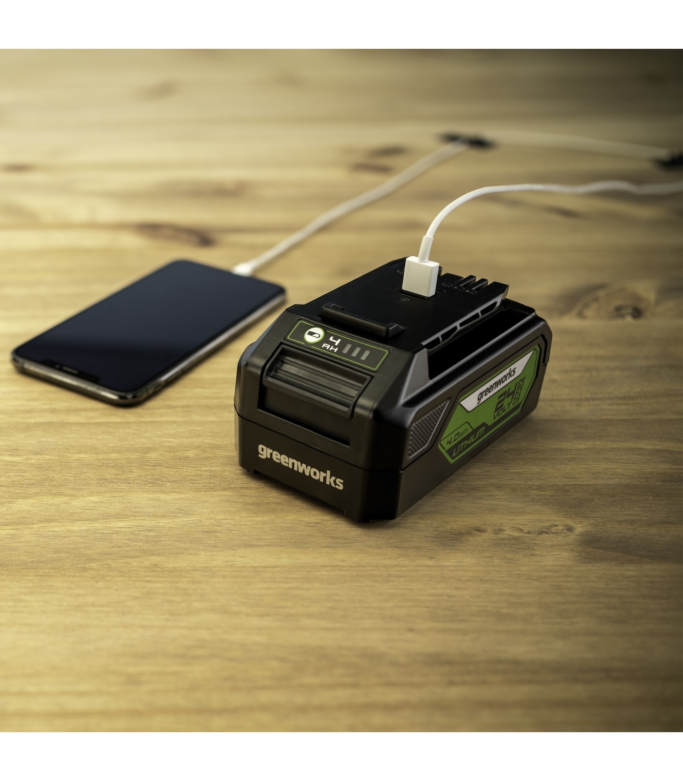 Универсальная аккумуляторная батарея платформы Greenworks POWERALL 24 V с USB-разъёмом для заряда мобильных устройств.