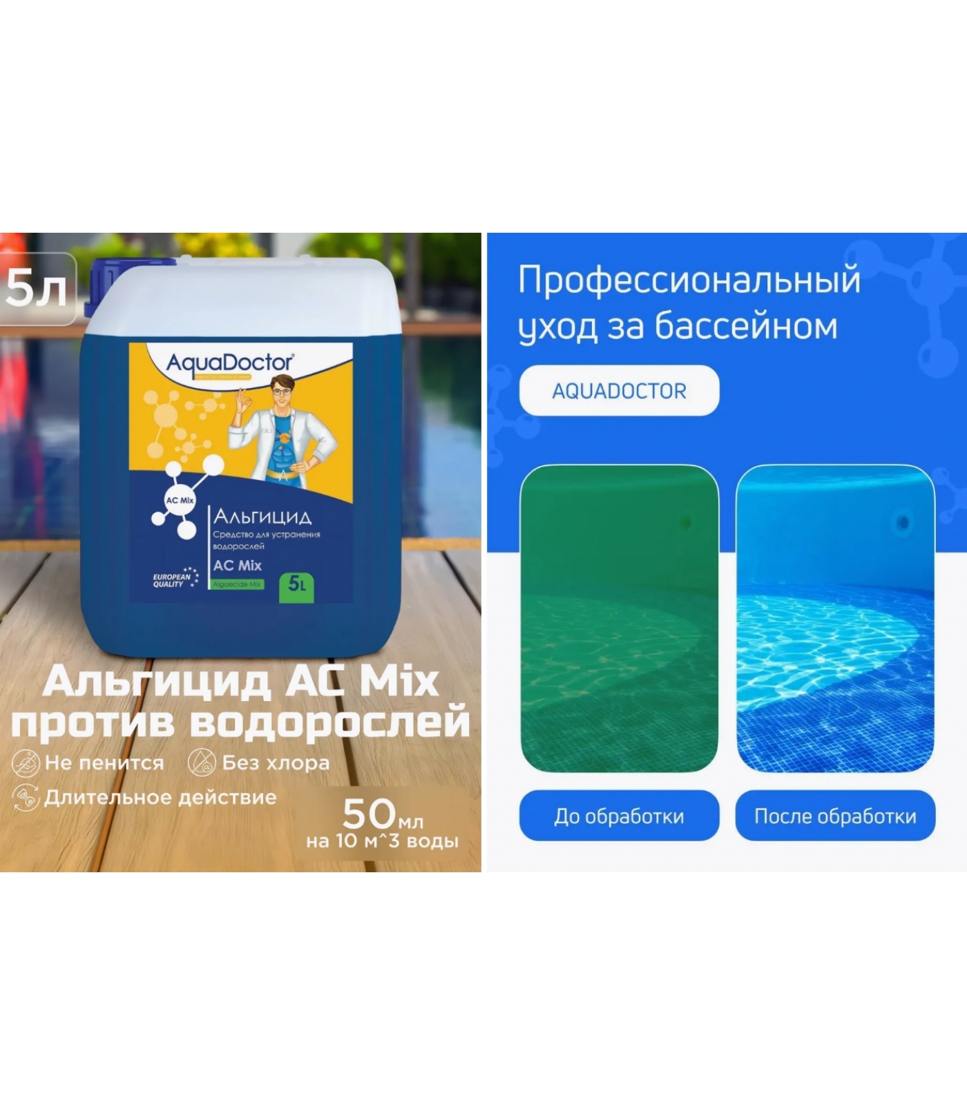 Альгицид Аквадоктор АС Mix – быстродейственный жидкий, не пенящийся химический состав с мощным бактерицидным, противогрибковым, противоводорослевым и противоспоровым действием. Предназначен для проведения шоковой обработки воды в бассейне. Устраняет и предотвращает появление водорослей, бактерий, грибков и спор в воде бассейна. Быстро делает воду прозрачной и кристально чистой.
