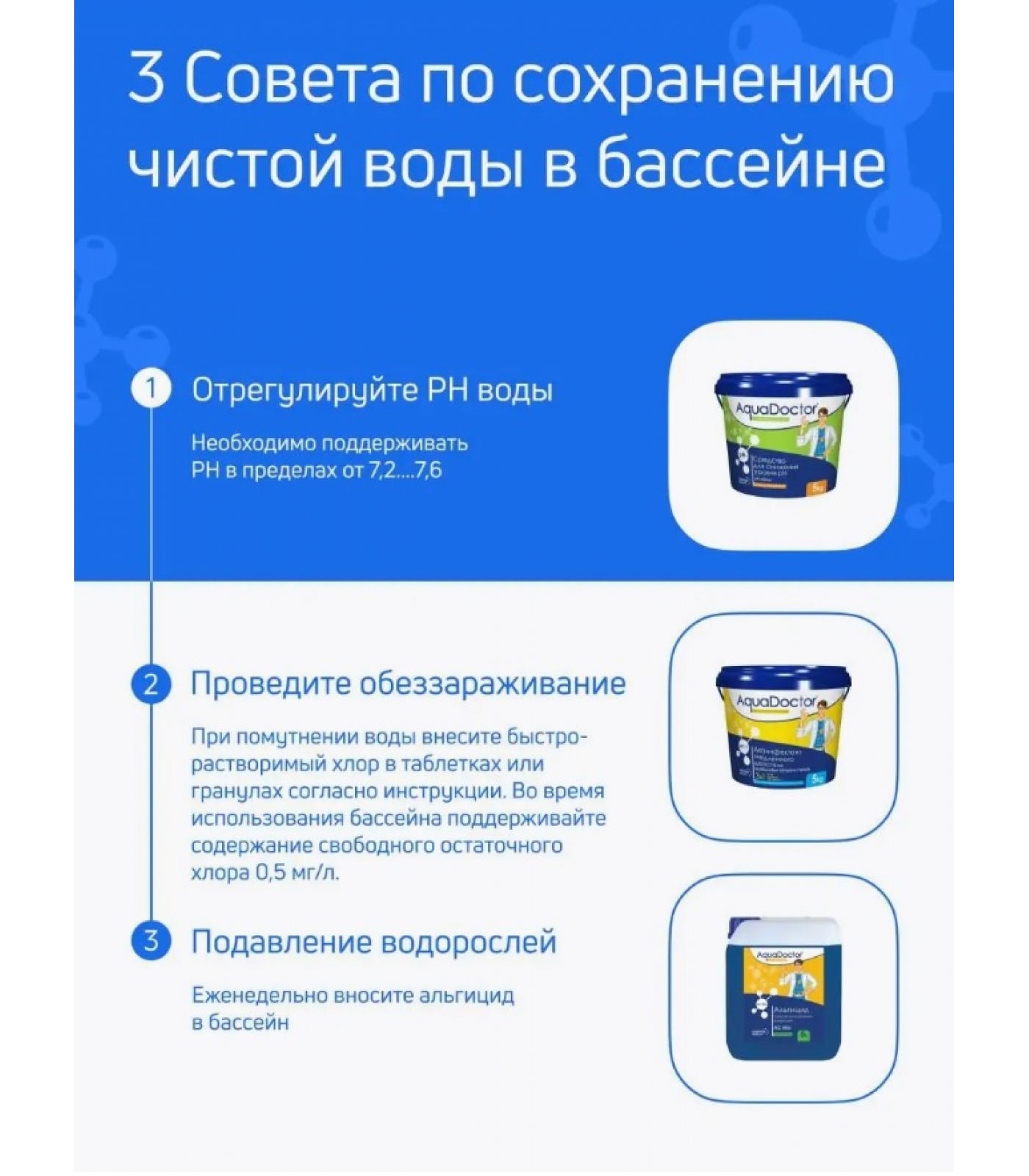 Препарат рекомендуется использовать в вечернее время суток. Перед использованием AquaDoctor AC Mix, необходимо замерять и откорректировать, при необходимости, уровень pH до нормы 7.2 - 7.4, с помощью средств AquaDoctor pH Minus или AquaDoctor ph Plus.