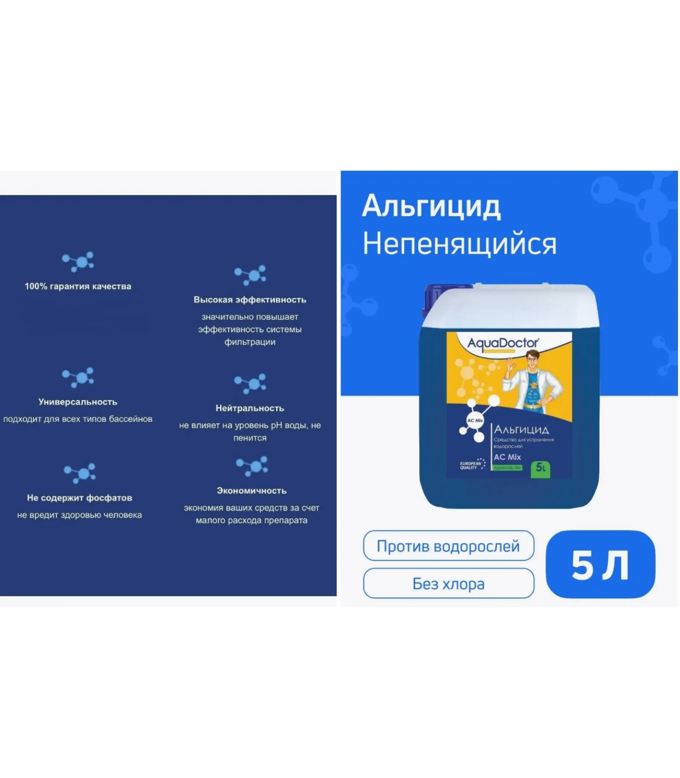 Альгитин дезинфицирующее средство по уходу за бассейном. Совместим с дозатором и фильтром для бассейнов. Также поспособствует полной дезинфекции воды в фонтане на даче. Жидкость без хлора безопасна здоровью человека и подойдет для детского купания. Не рекомендуется проводить водные процедуры в течение 12 часов после обработки воды. Эффективность увеличивается при работе песочного фильтра и фильтрационной системы.