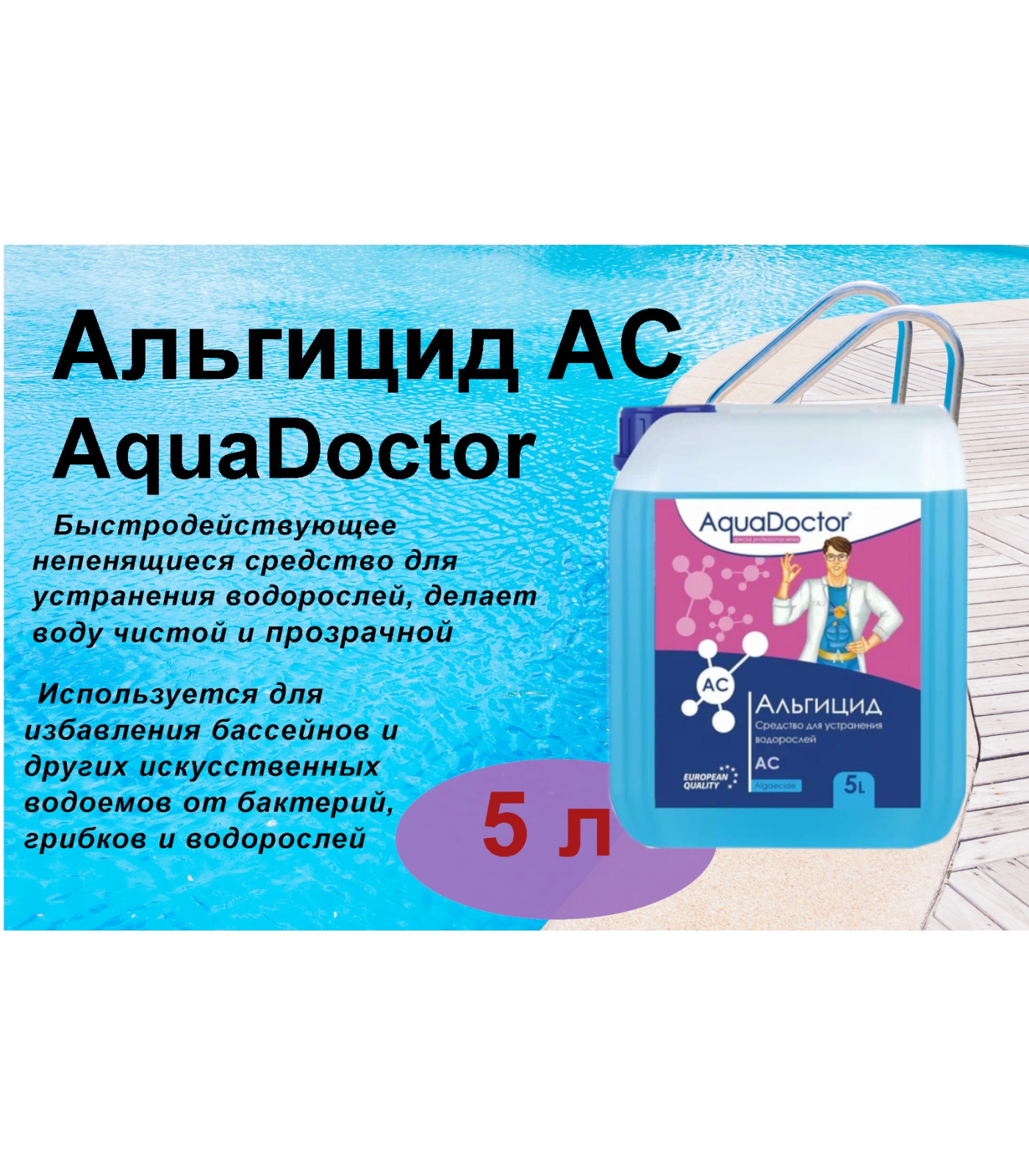 Aquadoctor АС – жидкий альгицид с сильным антибактериальным противогрибковым и противоводорослевым эффектом. Не создает пену. Используется для избавления бассейнов и других искусственных водоемов от бактерий, грибков и водорослей. Форма поставки: жидкий концентрат.
