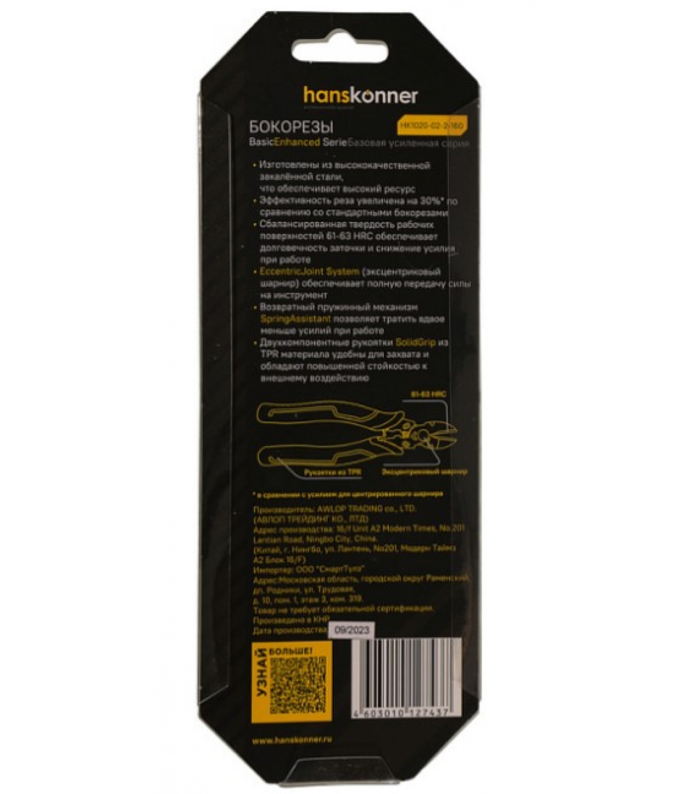 Бокорезы 160мм, эксцентриковый шарнир, +30% к силе реза, СrV, TPR рукоятки Hanskonner