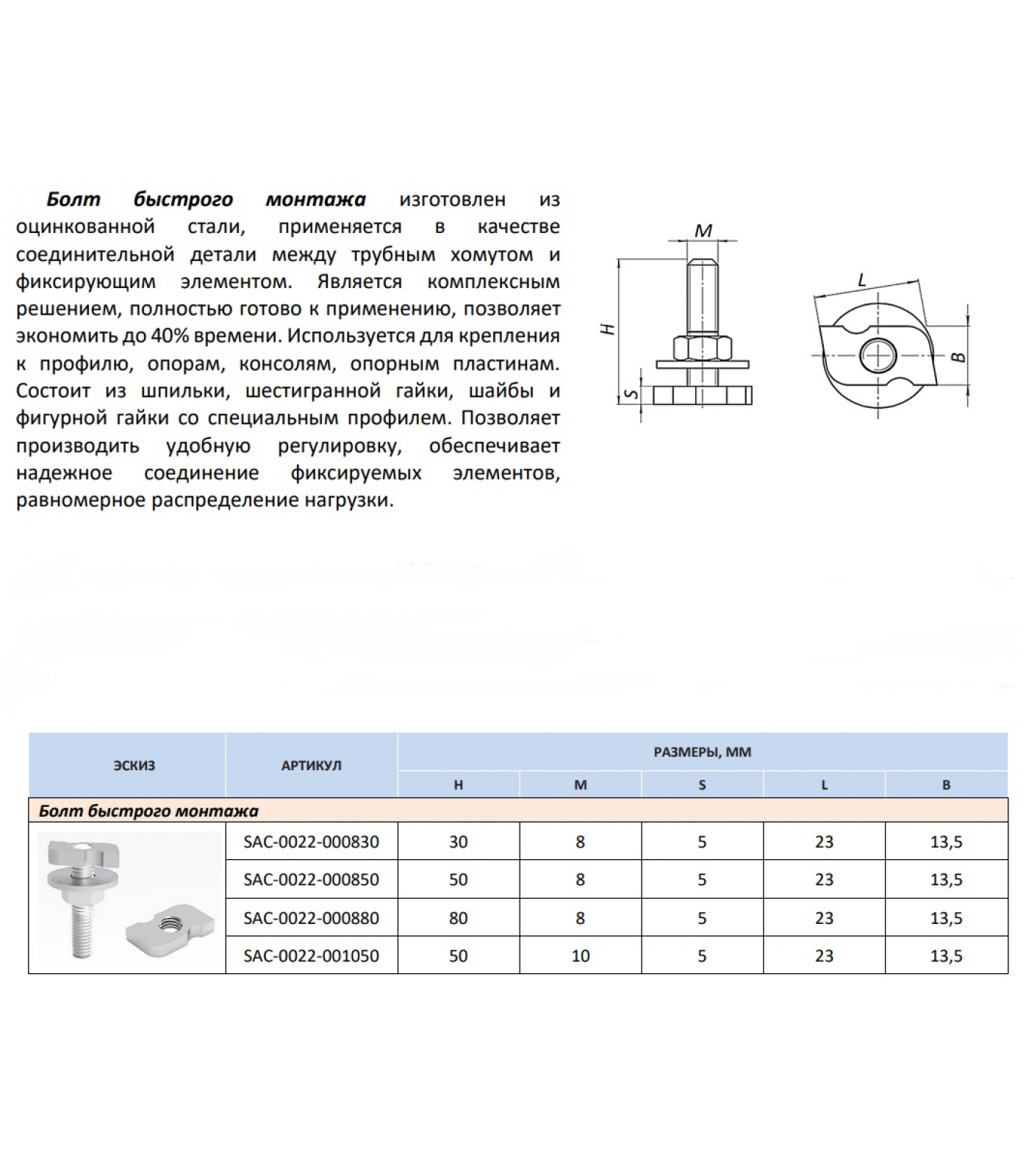 Болт быстрого монтажа изготовлен из оцинкованной стали, применяется в качестве соединительной детали между трубным хомутом и фиксирующим элементом. Является комплексным решением, полностью готово к применению, позволяет экономить до 40% времени. Используется для крепления к профилю, опорам, консолям, опорным пластинам. Состоит из шпильки, шестигранной гайки, шайбы и фигурной гайки со специальным профилем. Позволяет производить удобную регулировку, обеспечивает надежное соединение фиксируемых элементов, равномерное распределение нагрузки.