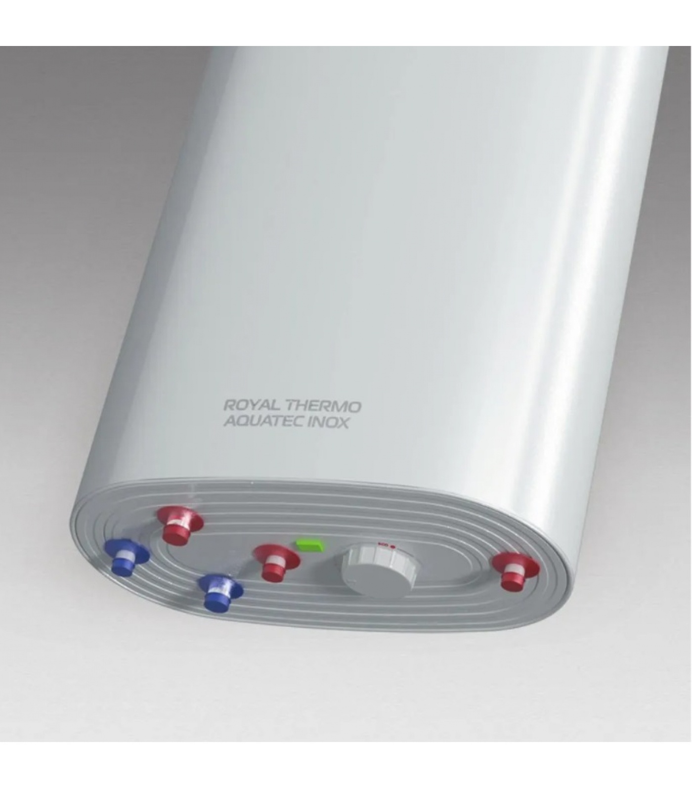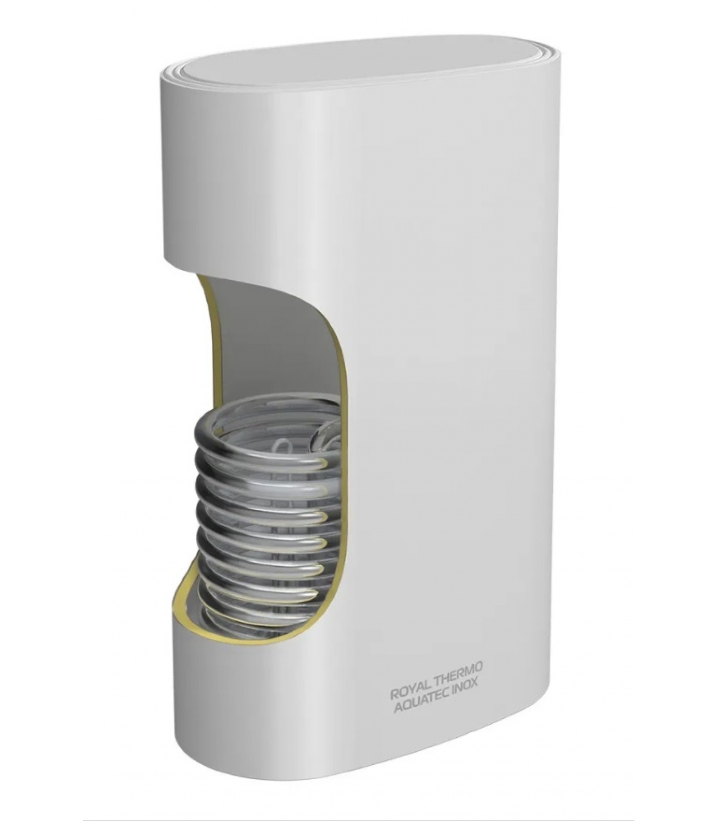 Royal Thermo AQUATEC INOX-F — настенный бойлер комбинированного нагрева, имеет один встроенный ТЭН. Бак для воды изготавливается из нержавеющей стали, а также имеет один теплообменник.