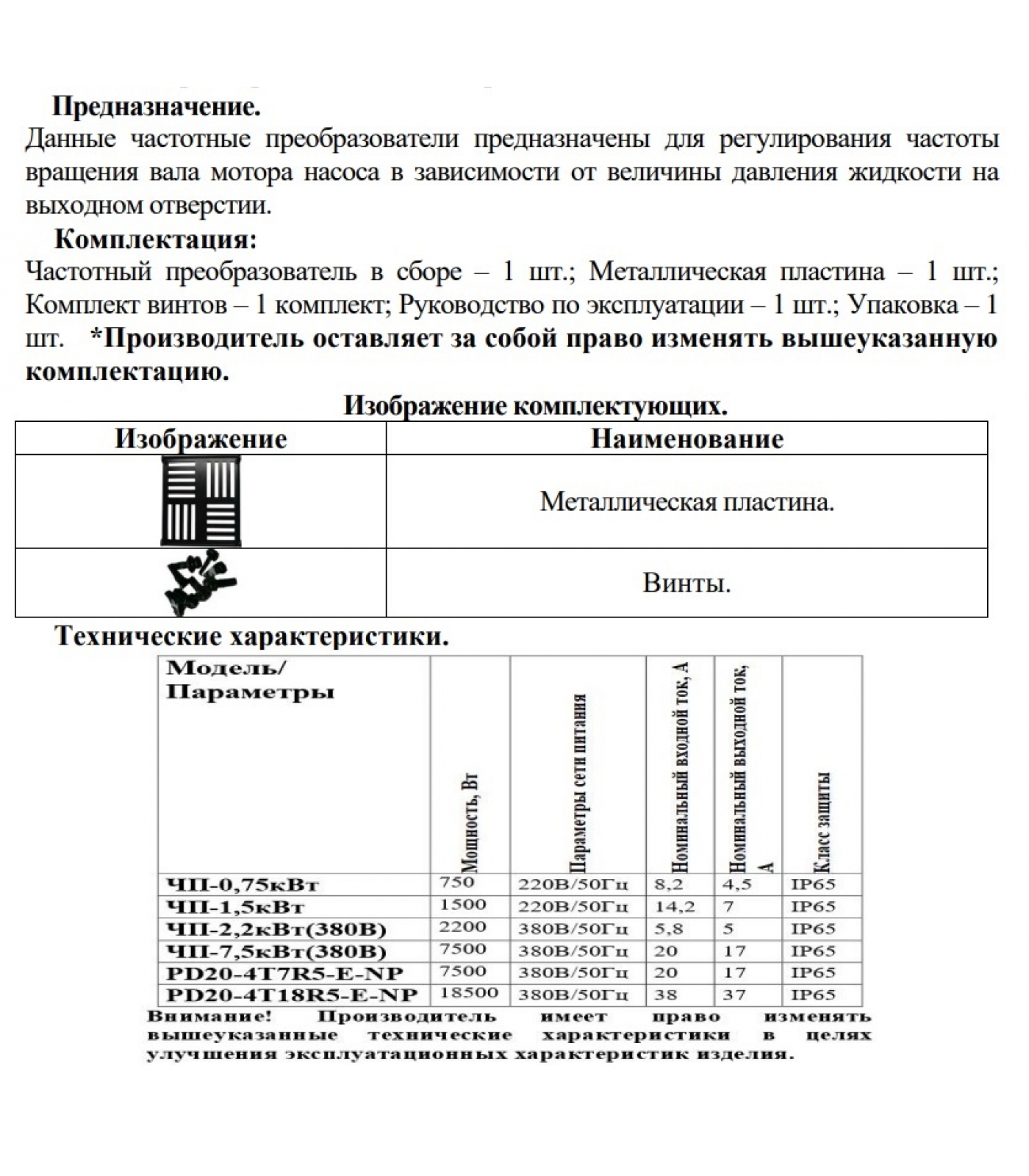 1. Частотный преобразователь в сборе – 1 шт.;