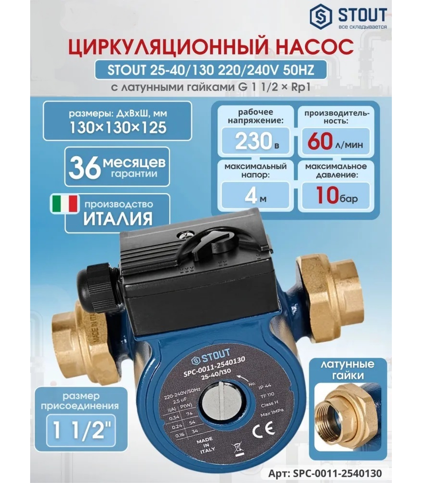 Циркуляционный насос 25-40/130 220/240V 50Hz с латунными гайками G 1 1/2 x Rp 1