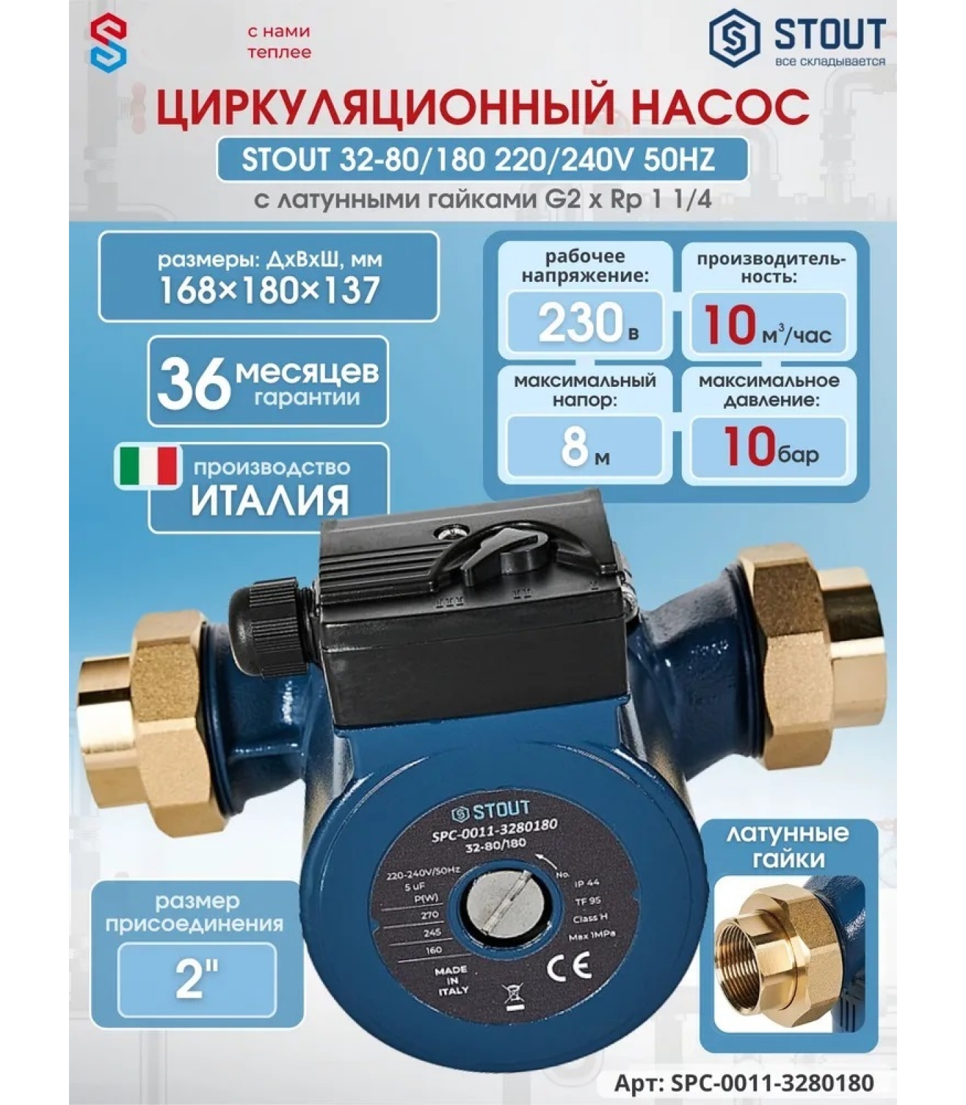 Циркуляционный насос 32-80/180 220/240V 50Hz с латунными гайками G2 x Rp 1 1/4