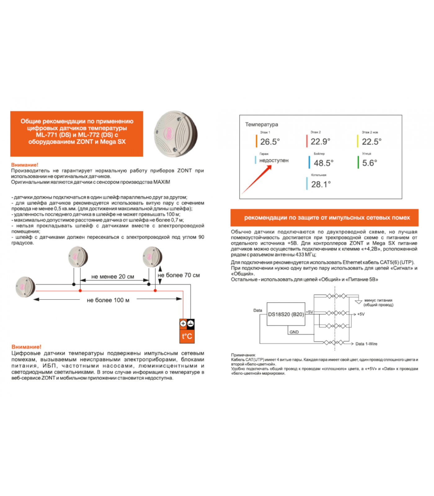 - датчики подключаются в шлейф параллельно; всего можно подключить до 10-ти шт.;