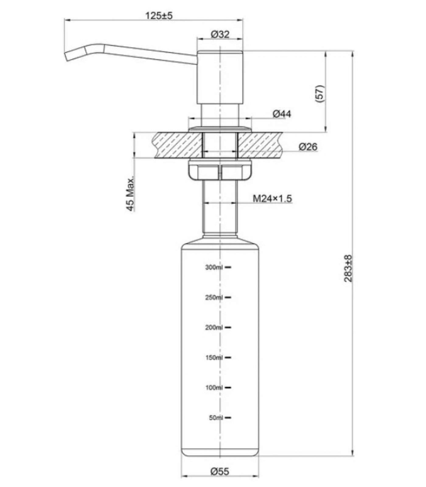 Максимальная толщина столешницы для монтажа дозатора 45 мм.
