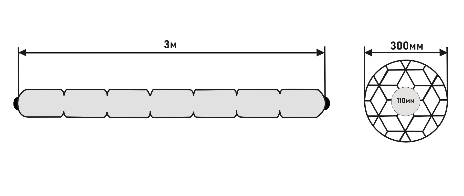 Секции дренажной системы имеют длину 3 м и производятся с внутренним диаметром 110 мм и внешним диаметром 300 мм.