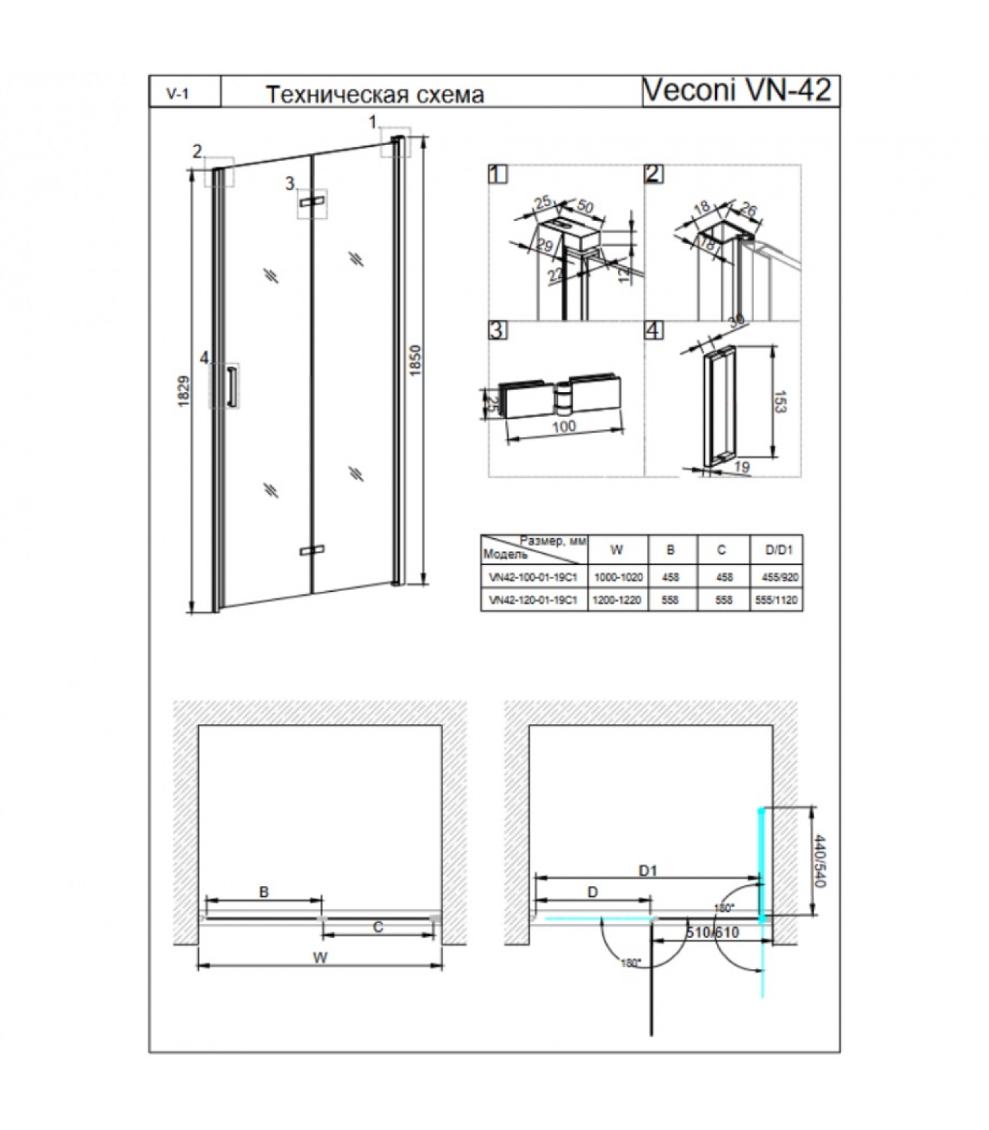 Душевая дверь Veconi складная VN42-100-01-19C1 1000x1900,хром,прозрачное