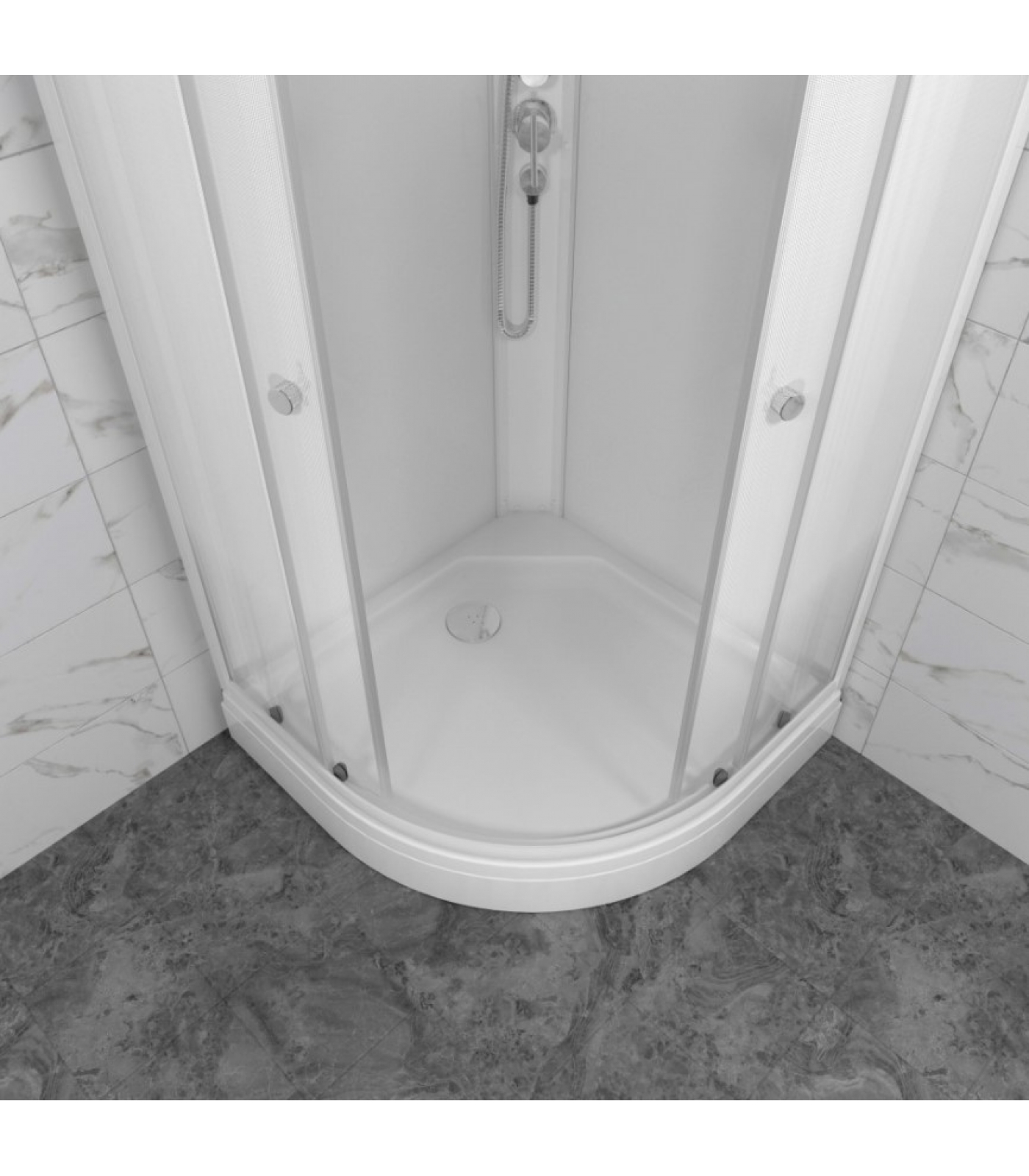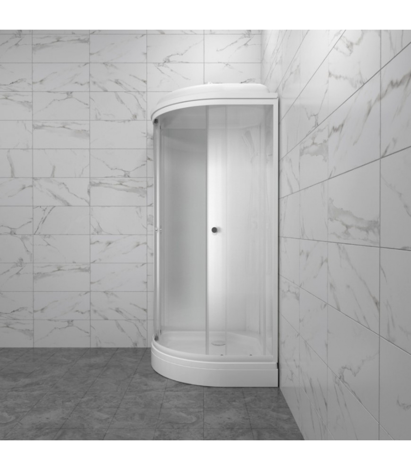 Благодаря угловой конструкции и поддону в форме четверти круга модель можно вписать даже в ванные комнаты небольшой площади. Кабина оснащена регулирумыми по высоте ножками, 2-х секционными раздвижными дверцами и крышей. Поддон выполнен из акрила, устойчивого к механическим повреждениям, обладающего небольшим весом и повышенной шумоизоляцией.