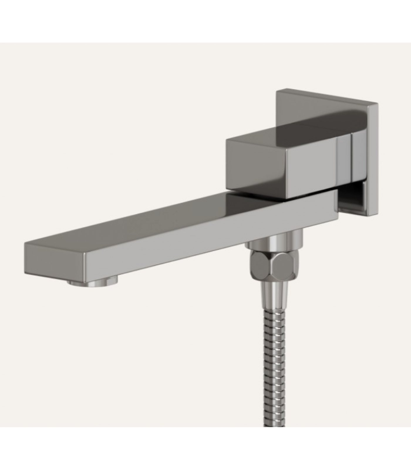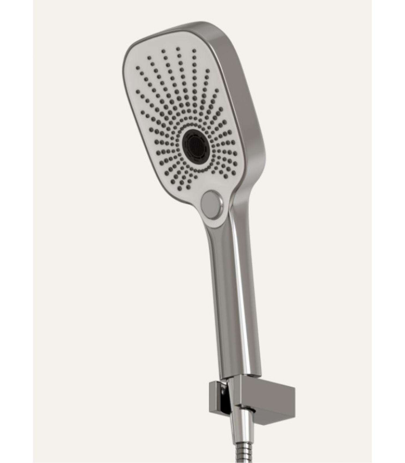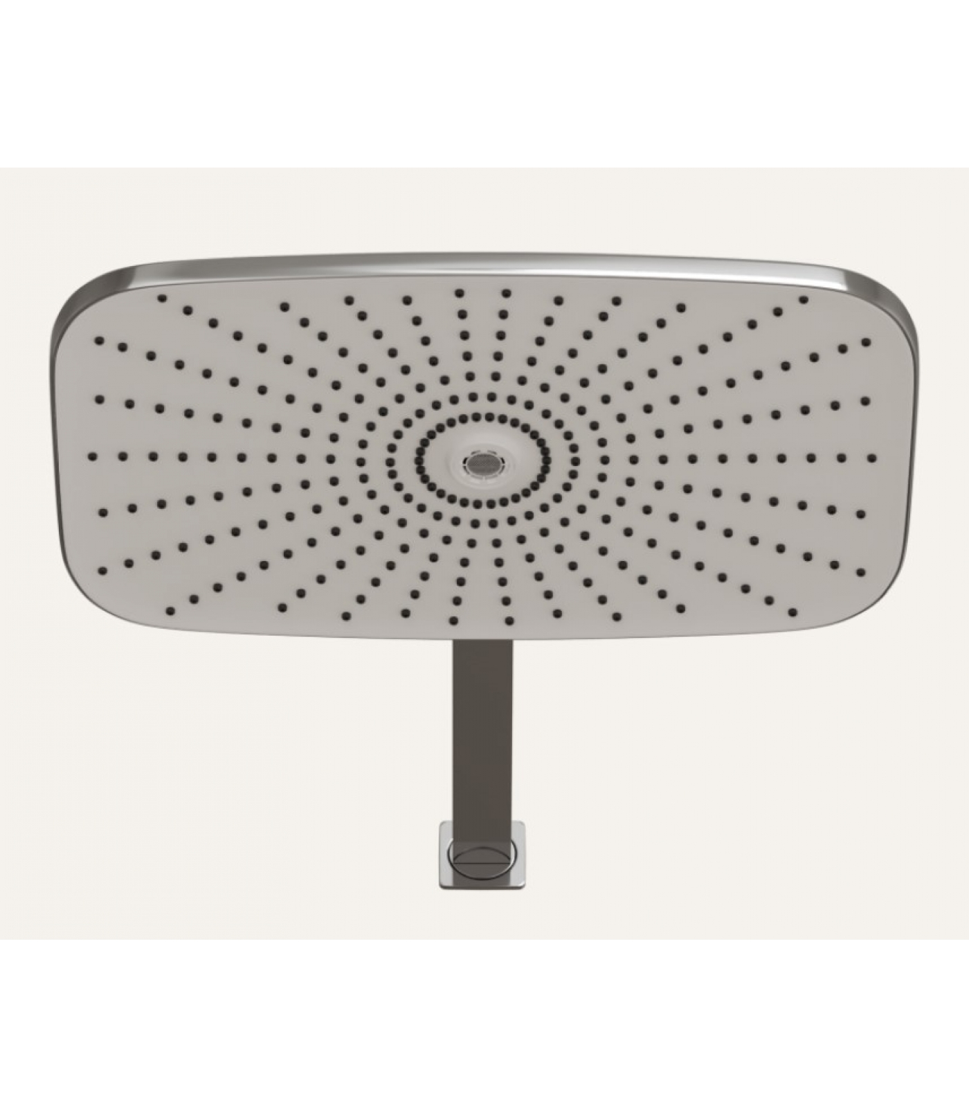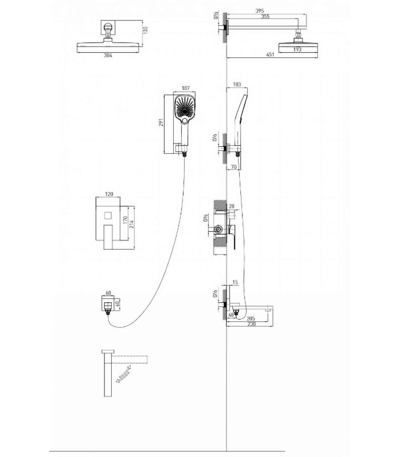 Комплектация: верхний душ, держатель для душевой лейки, душевая лейка, душевой шланг, излив, кронштейн, наружная часть смесителя, смеситель