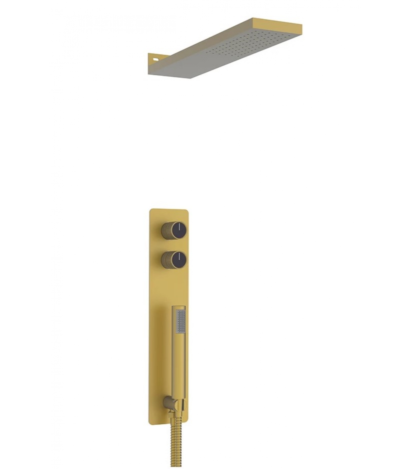 Ручная лейка имеет несколько режимов распыления воды, включая массажный и комбинированный. Штанга изготовлена из нержавеющей стали, а лейки - из ABS-пластика с покрытием “матовое золото”. Система монтируется встраиваемым способом, что позволяет сохранить эстетичный вид интерьера ванной комнаты.