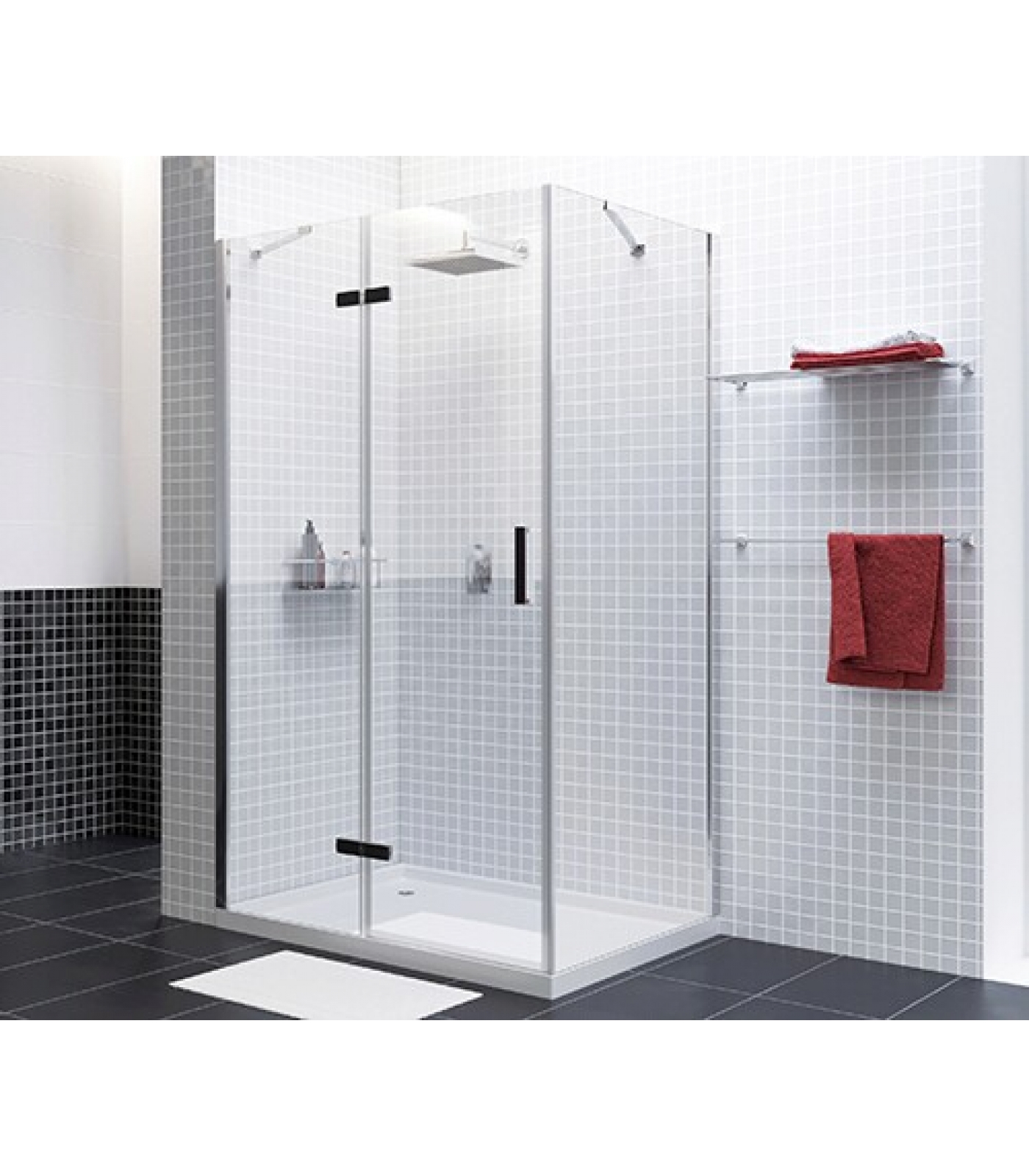 Закаленное прозрачное стекло 8 мм, Покрытие стекла WasserSchutz, Распашной механизм на петлях из латуни, Анодированный алюминиевый профиль 46 мм, Ручка двери из сплава металлов, Регулирующий профиль до 13 мм, Силиконовый уплотнитель двери с магнитным замком, Декоративные накладки из черного матового ABS-пластика на ручку и петли, Силиконовые уплотнители