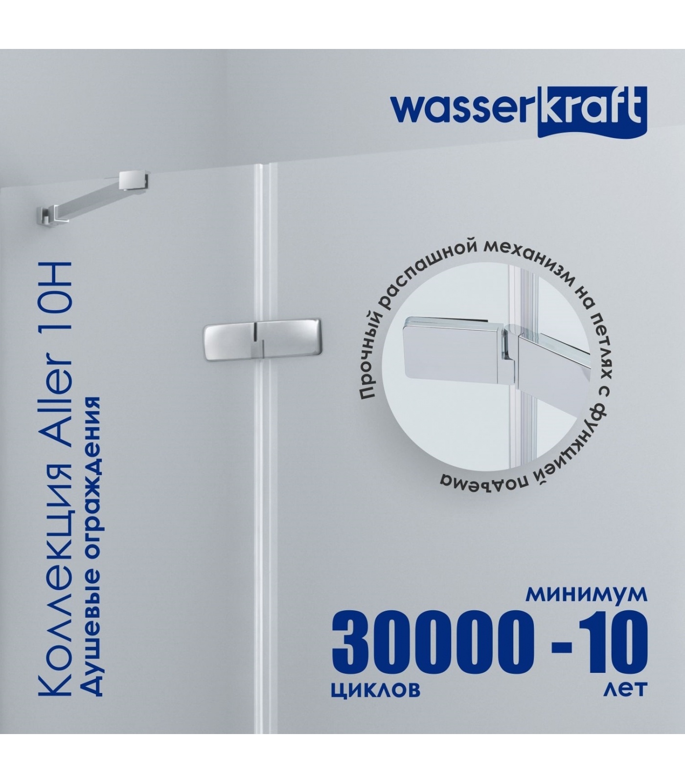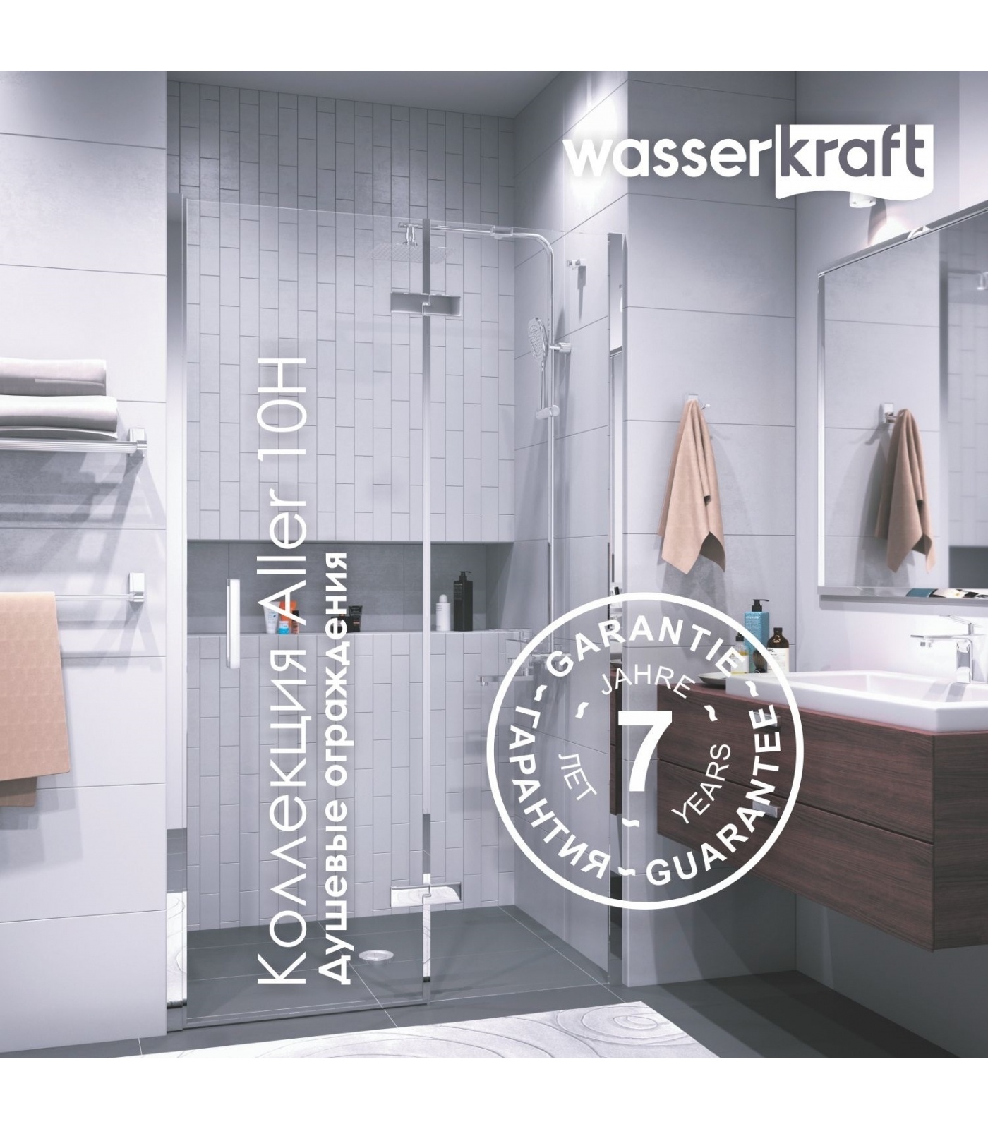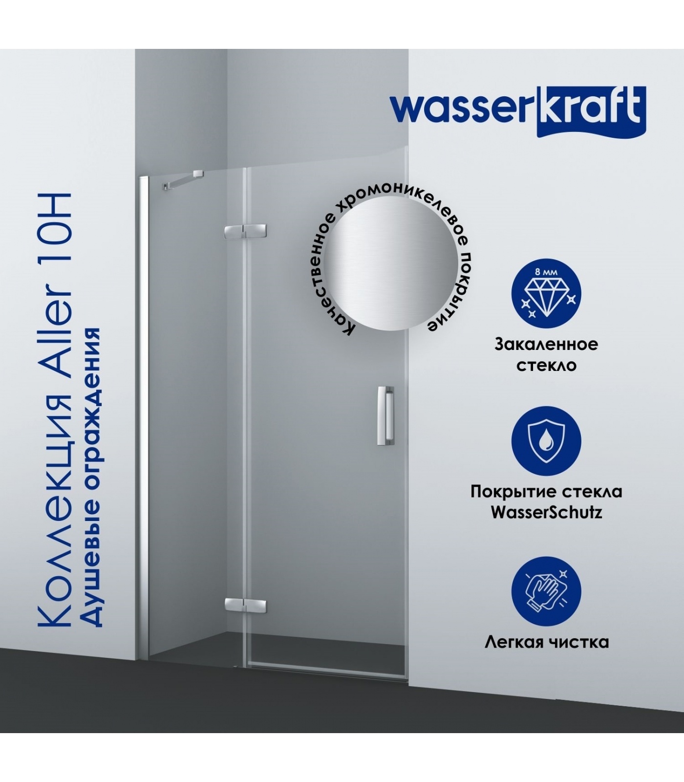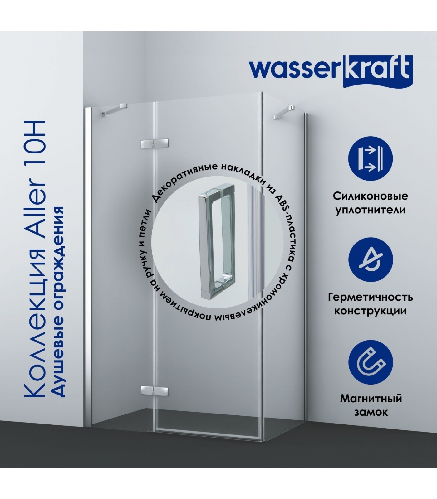 Закаленное прозрачное стекло 8 мм, Покрытие стекла WasserSchutz, Распашной механизм на петлях из латуни, Анодированный алюминиевый профиль 46 мм, Регулирующий профиль до 13 мм, Силиконовый уплотнитель двери с магнитным замком, Силиконовые уплотнители