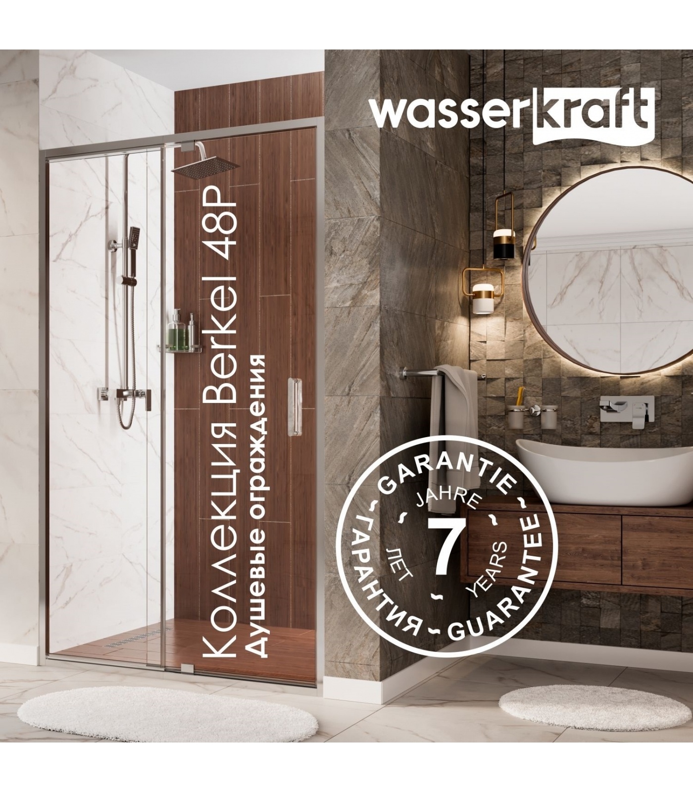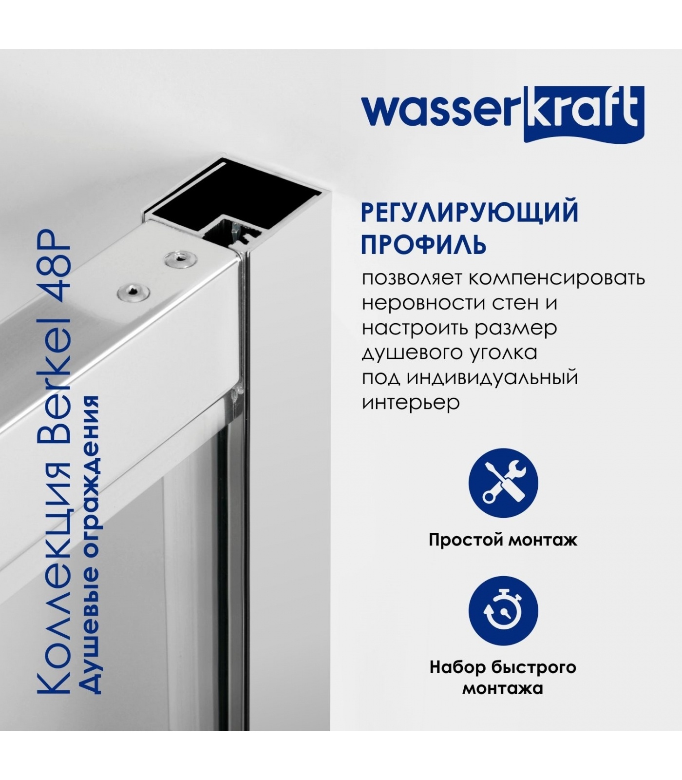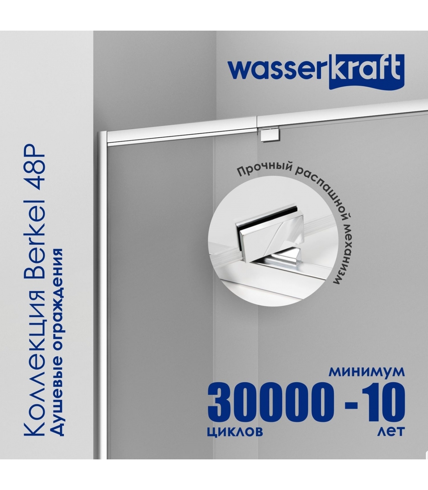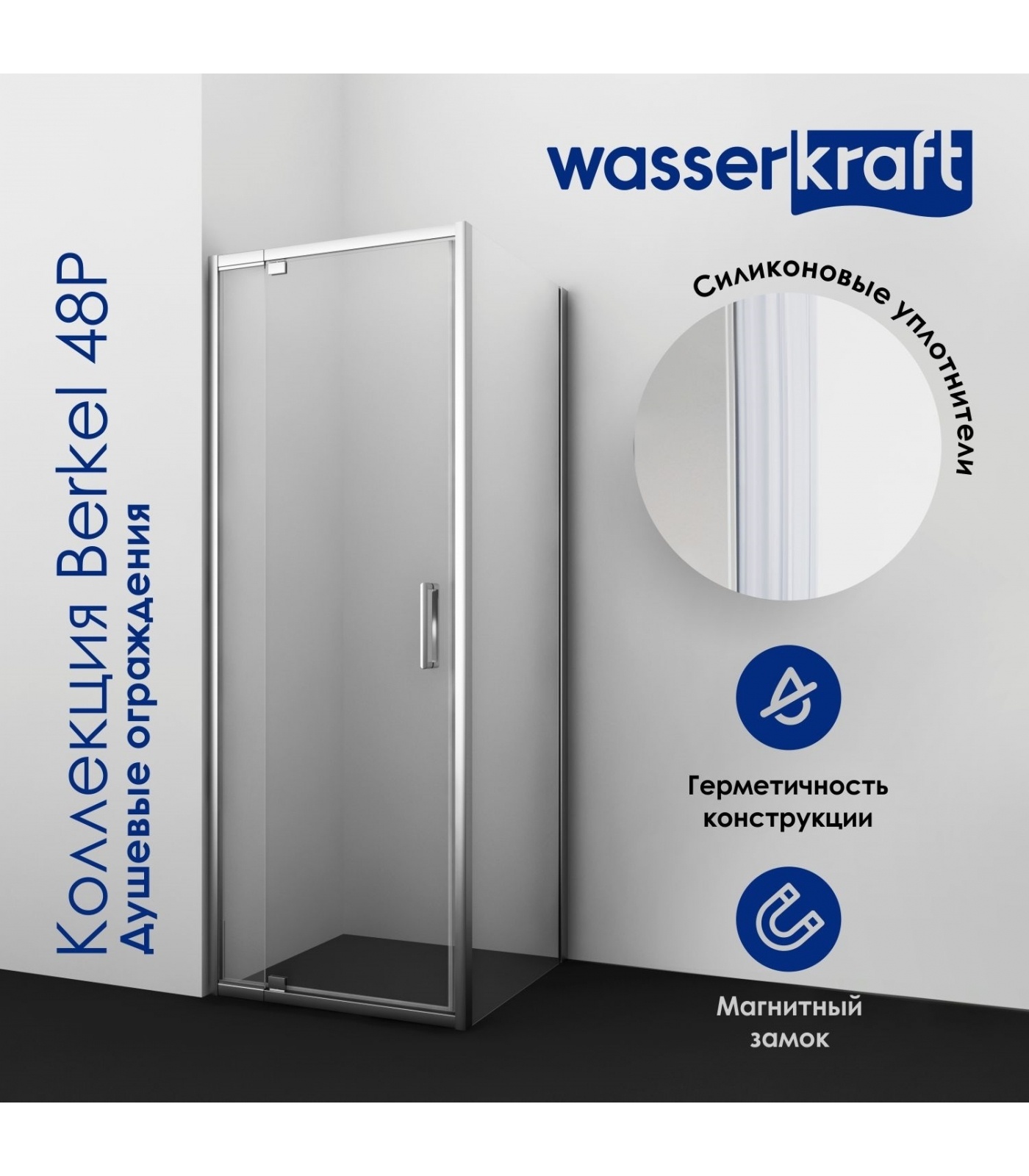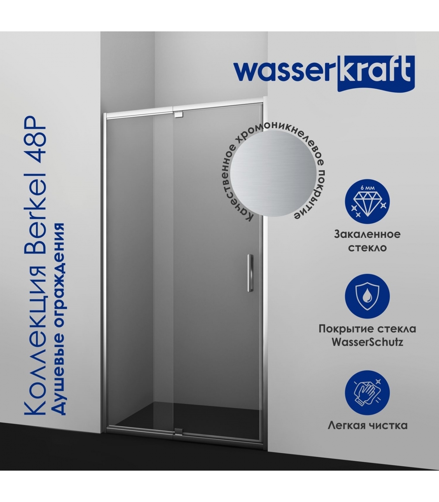Закаленное прозрачное стекло 6 мм, Покрытие стекла WasserSchutz, Распашной механизм из сплава металлов , Анодированный алюминиевый профиль 30 мм , Ручка двери из сплава металлов, Регулирующий профиль до 30 мм, Телескопический регулирующий профиль до 20 мм, Силиконовый уплотнитель двери с магнитным замком, Силиконовые уплотнители