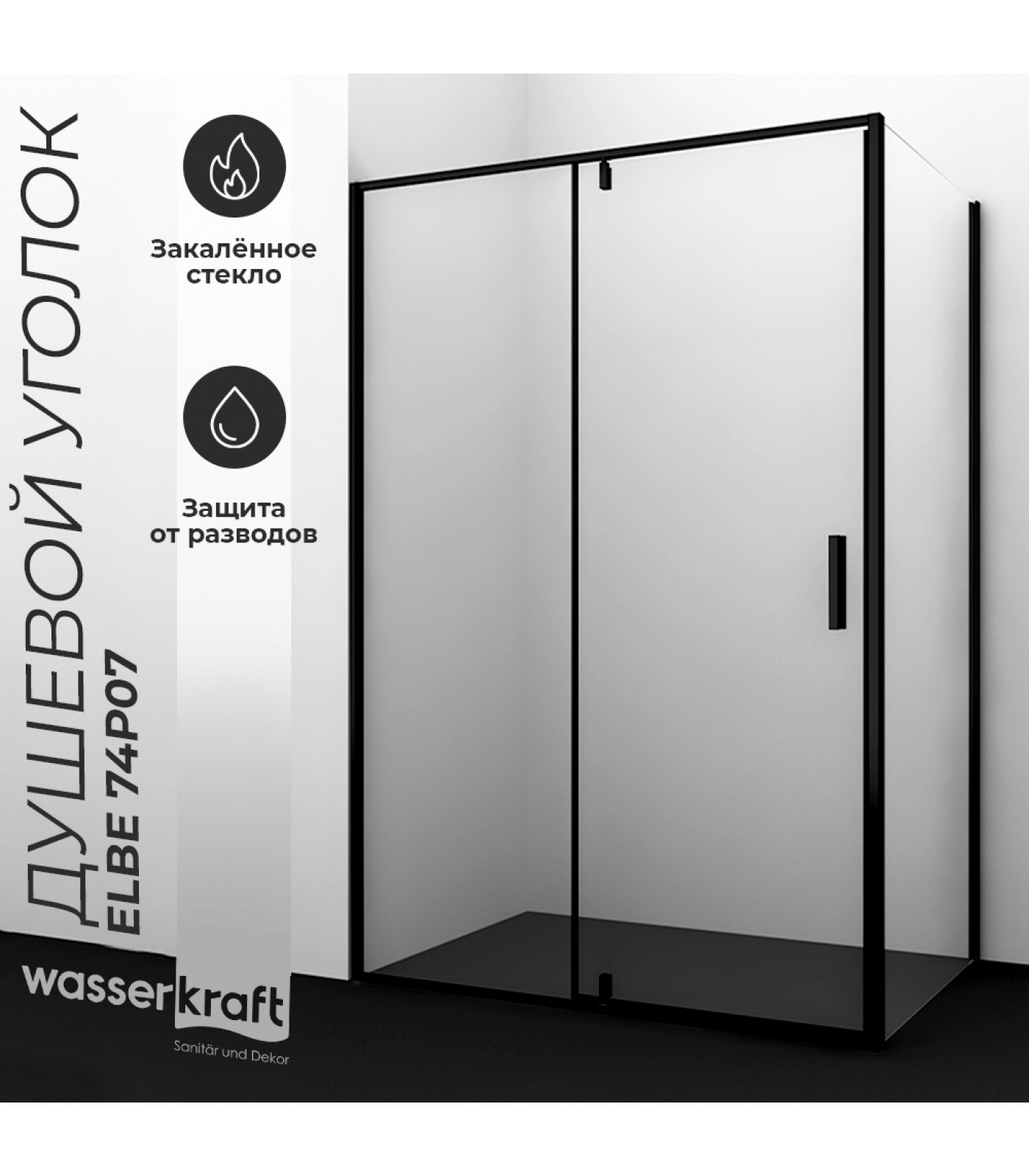 Закаленное прозрачное стекло 6 мм, Покрытие стекла WasserSchutz, Распашной механизм из сплава металлов , Анодированный алюминиевый профиль 25 мм, Ручка двери из сплава металлов, Регулирующий профиль до 15 мм, Силиконовый уплотнитель дверей с магнитным замком, Цвет профиля: черный, Силиконовые уплотнители