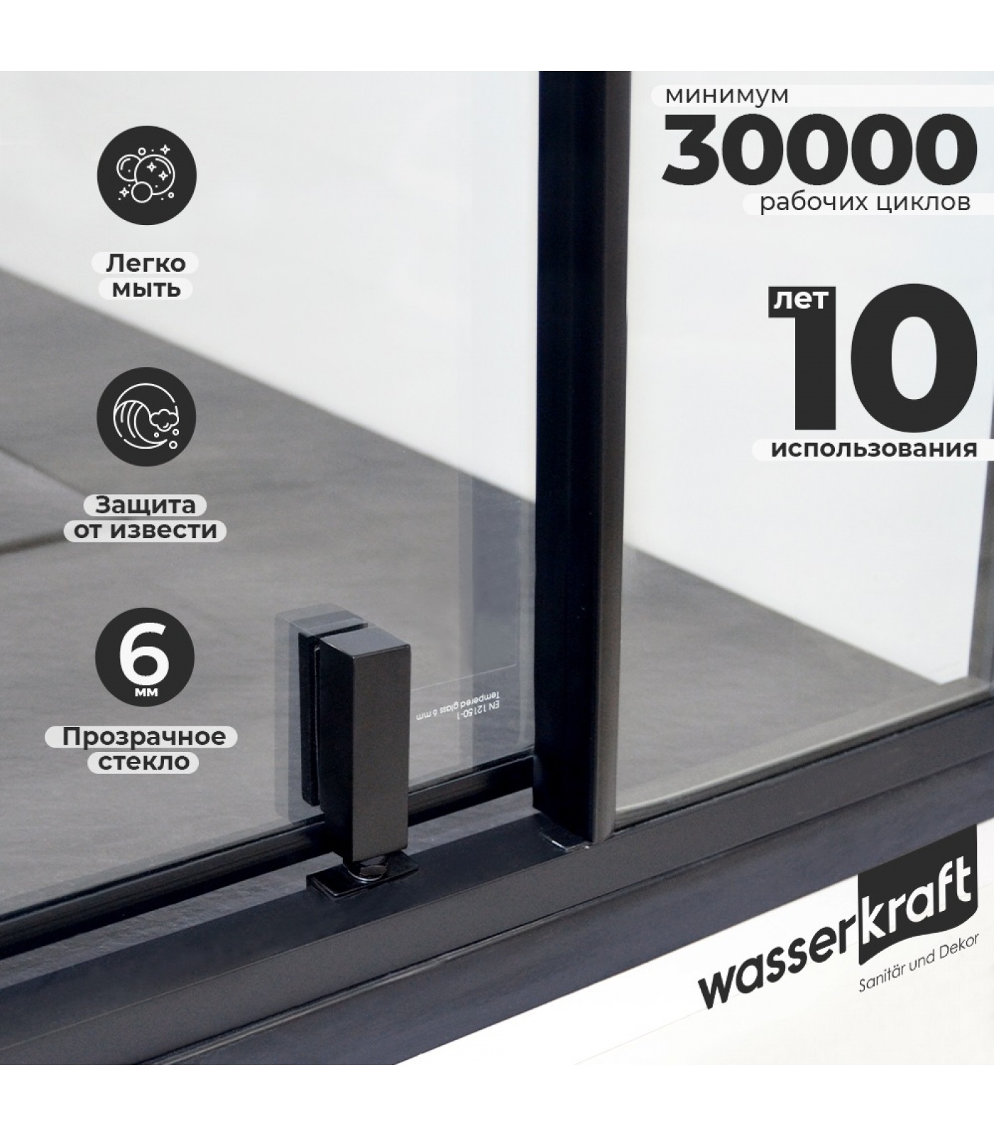Закаленное прозрачное стекло 6 мм, Покрытие стекла WasserSchutz, Распашной механизм из сплава металлов , Анодированный алюминиевый профиль 25 мм, Ручка двери из сплава металлов, Регулирующий профиль до 15 мм, Силиконовый уплотнитель дверей с магнитным замком, Цвет профиля: черный, Силиконовые уплотнители