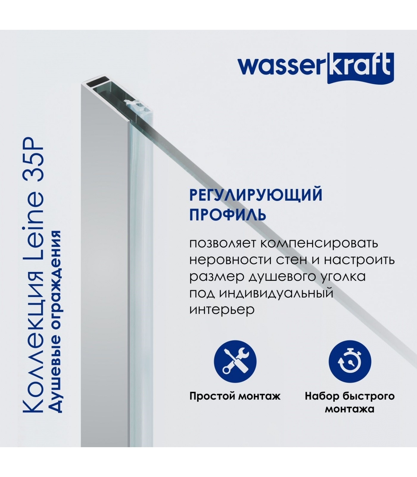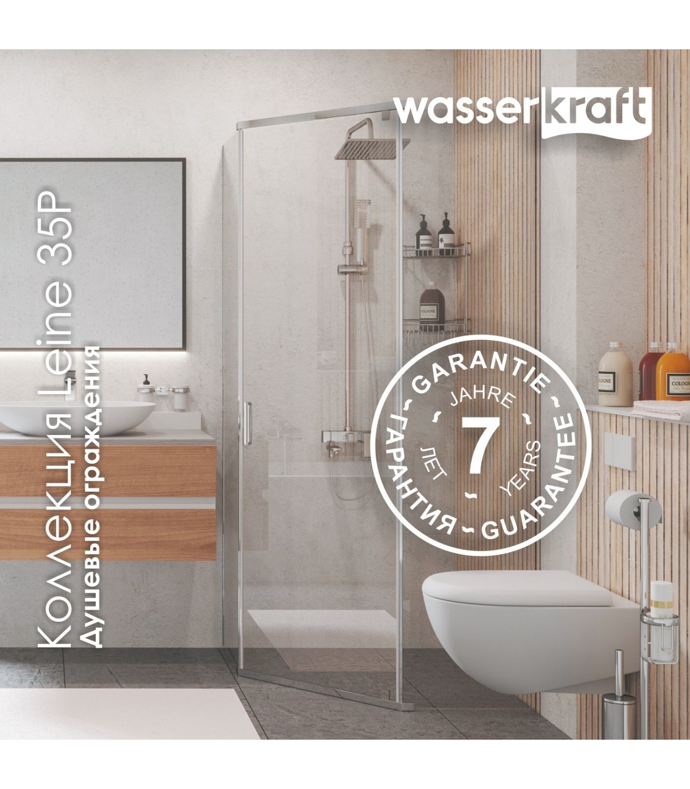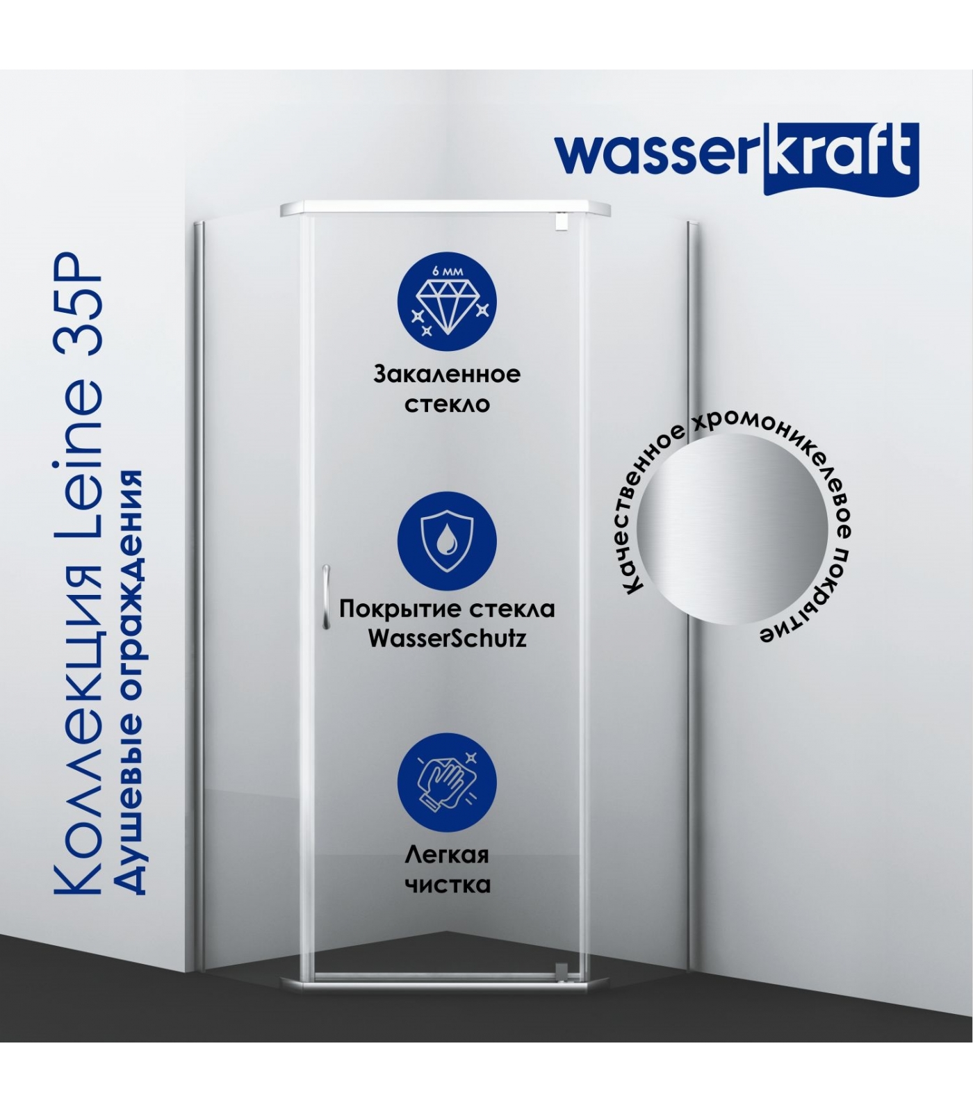 Душевой уголок Wasserkraft Leine 90x90 35P11 предполагает универсальную установку. Форма у него пятиугольная. Положение в углу предполагает наличие свободного места в углу. В конструкции изделия шириной 900 мм и глубиной 900 мм используется прозрачное стекло толщиной 6 мм. Оно придает душевому уголку незаурядность. Стекло закаленное, а поэтому нетравматичное. У модели распашные двери с продуманной конструкцией открывания/закрывания. Профиль из алюминия делает акцент на прозрачность и воздушность конструкции. Проектируя ванную комнату, следует учесть, что установка этого душевого уголка без поддона возможна. Кстати, поддон приобретается отдельно. Произведен уголок в Германии.