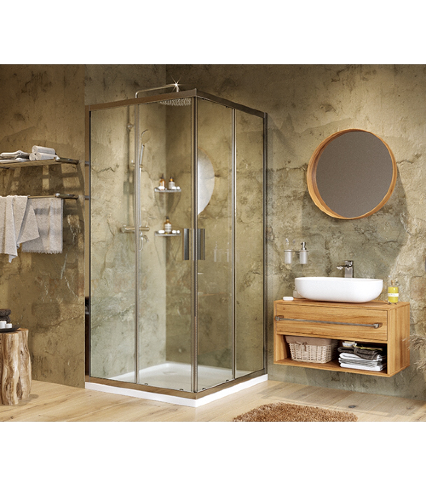 Закаленное прозрачное стекло 6 мм, Раздвижной механизм из нержавеющей стали , Анодированный алюминиевый профиль 39 мм, Ручки дверей из алюминия и ABS-пластика, Регулирующий профиль до 15 мм, Механизм легкой чистки , Силиконовый уплотнитель дверей с магнитным замком, Силиконовые уплотнители