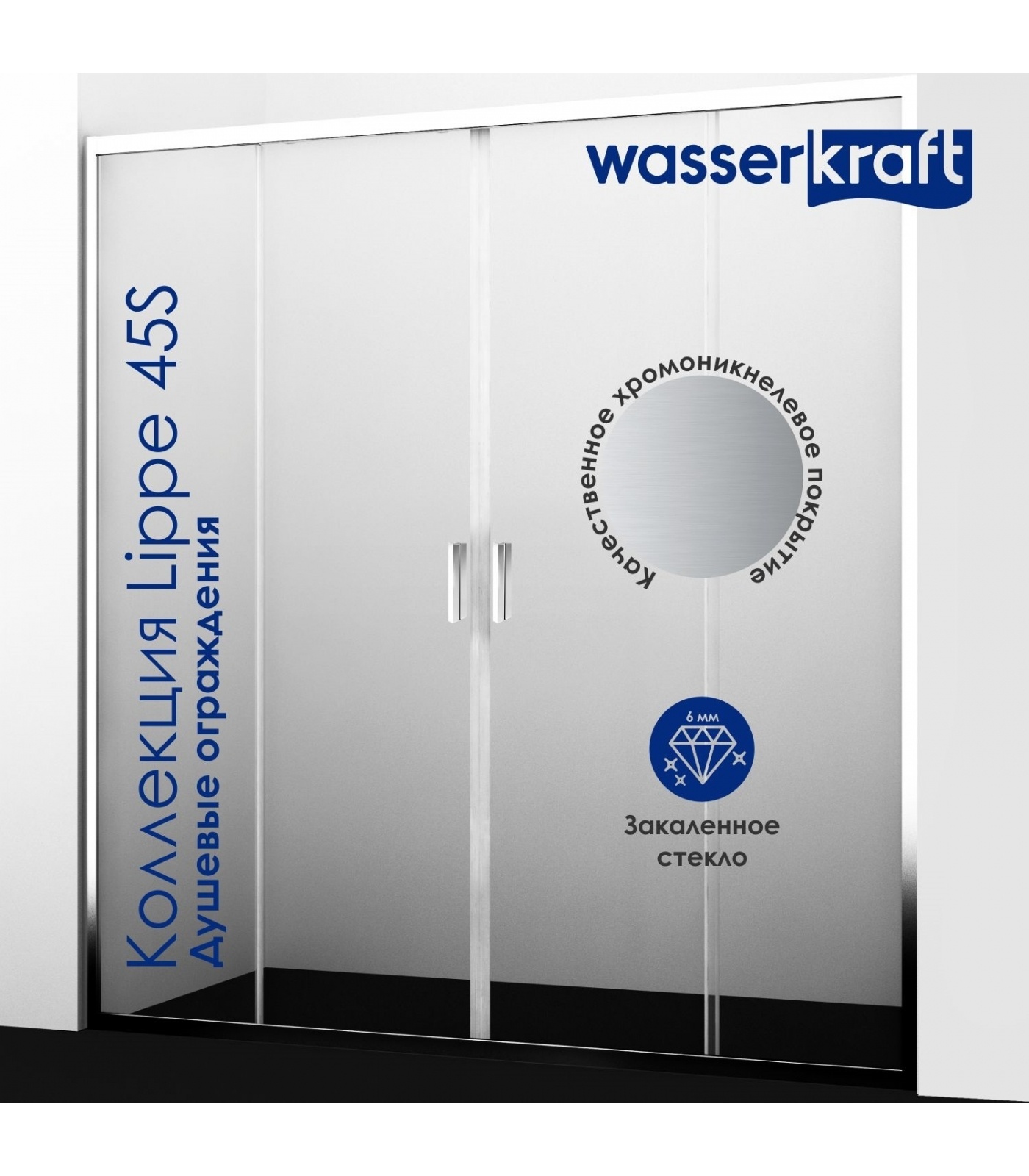 Закаленное прозрачное стекло 6 мм, Раздвижной механизм из нержавеющей стали , Анодированный алюминиевый профиль 39 мм, Ручки дверей из алюминия и ABS-пластика, Регулирующий профиль до 15 мм, Механизм легкой чистки , Силиконовый уплотнитель дверей с магнитным замком, Силиконовые уплотнители