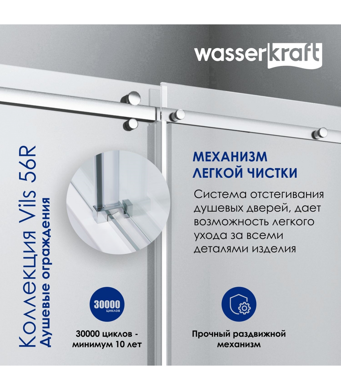 Закаленное прозрачное стекло 6/8 мм, Роликовый механизм из латуни, Анодированный алюминиевый профиль 36,5 мм , Ручка двери из ABS-пластика , Регулирующий профиль двери до 15 мм, Регулирующий профиль обратной панели до 10 мм, Механизм легкой чистки , Силиконовый уплотнитель двери с магнитным замком, Силиконовые уплотнители