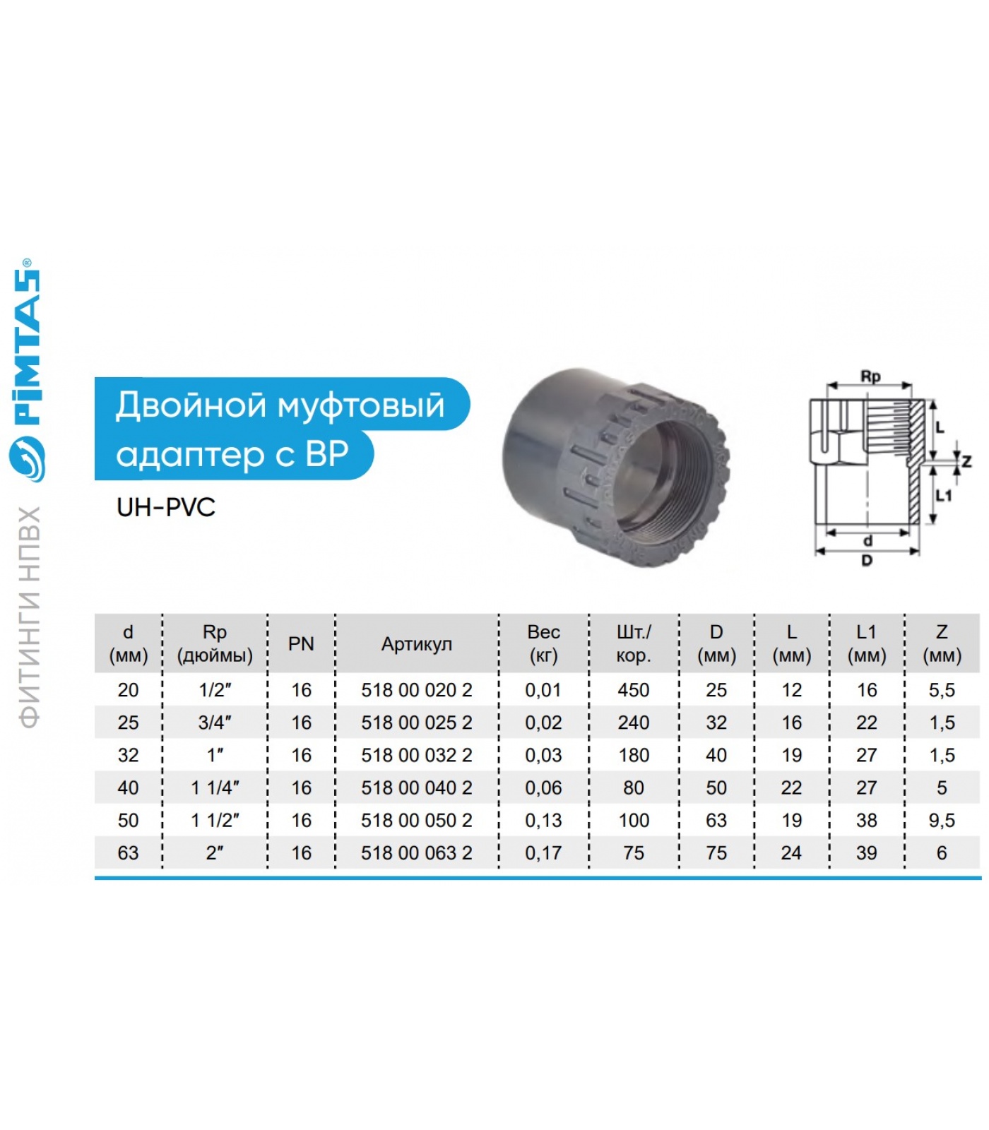Двойной муфтовый адаптер с внутренней резьбой Pimtas из непластифицированного поливинилхлорида PVC-U. Производство Турция.