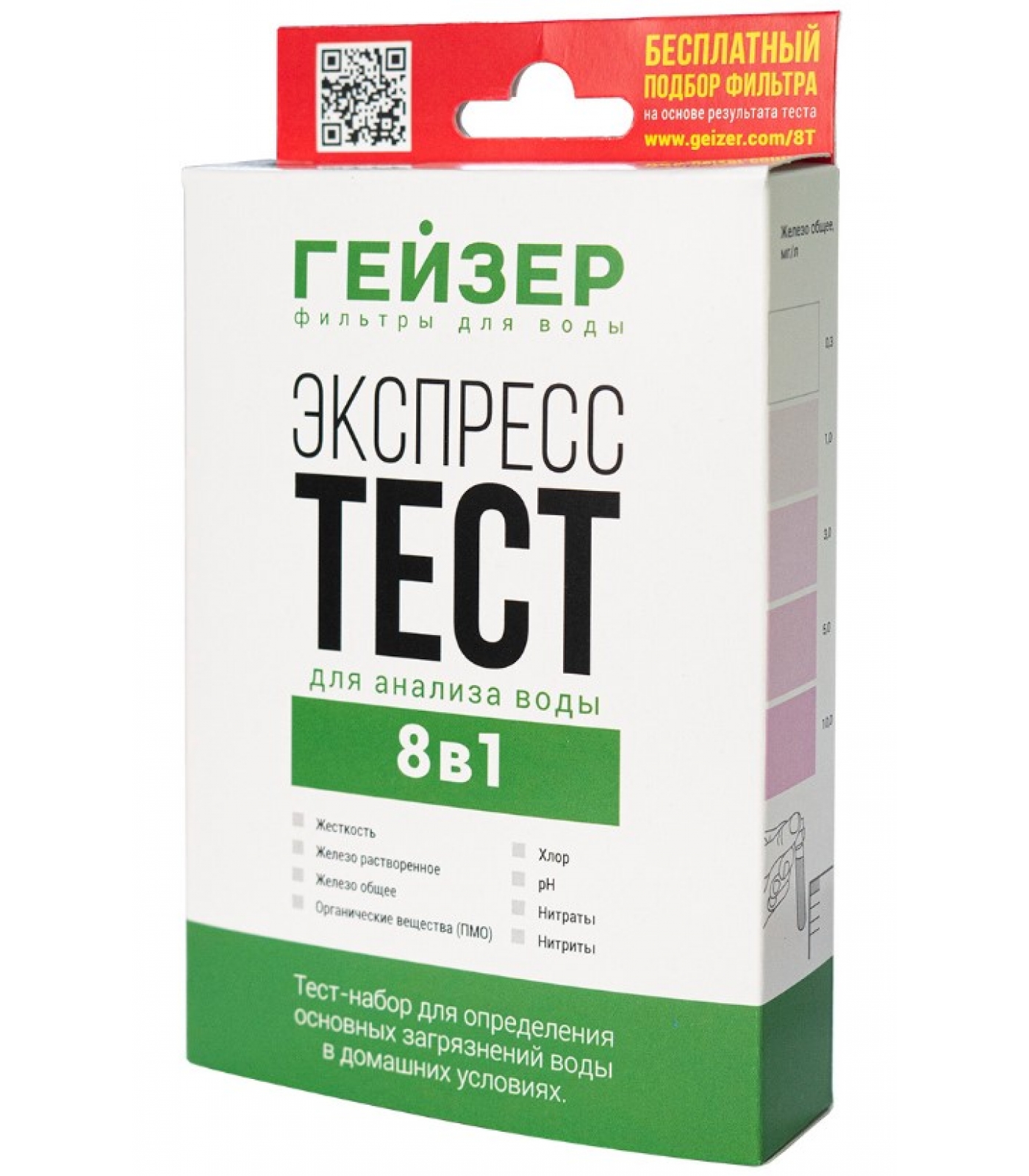 Экспресс-тест для анализа воды «Гейзер» – это быстрый и простой способ для определения основных показателей загрязнения в домашних условиях. Он позволяет определить в воде: нитраты, нитриты, общую жесткость, активный хлор, растворенное железо, железо общее, перманганатную окисляемость и кислотность (pH).