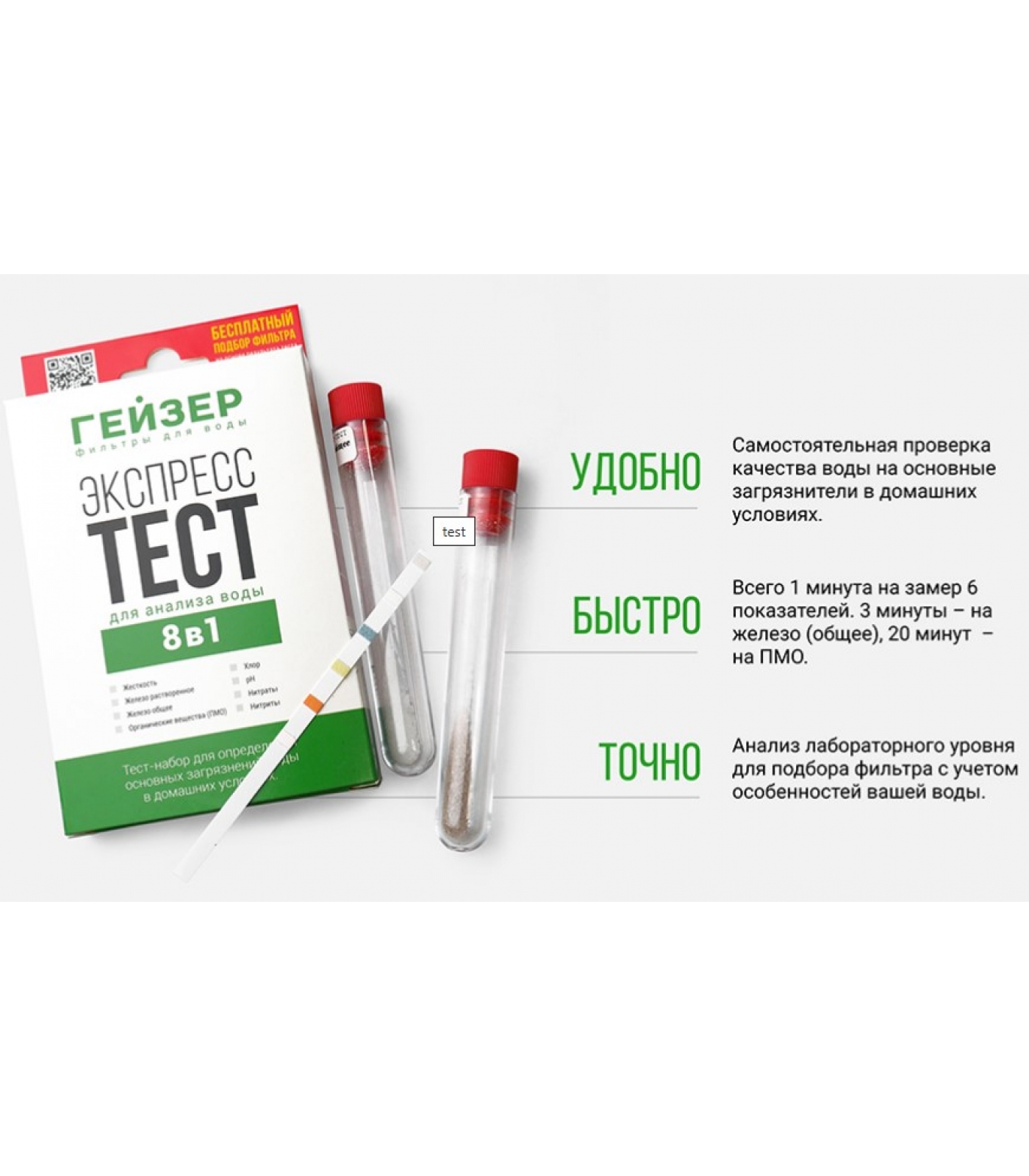 Экспресс-анализ воды Гейзер – удобный и бюджетный способ проверки воды на наличие основных типов потенциально вредных примесей.