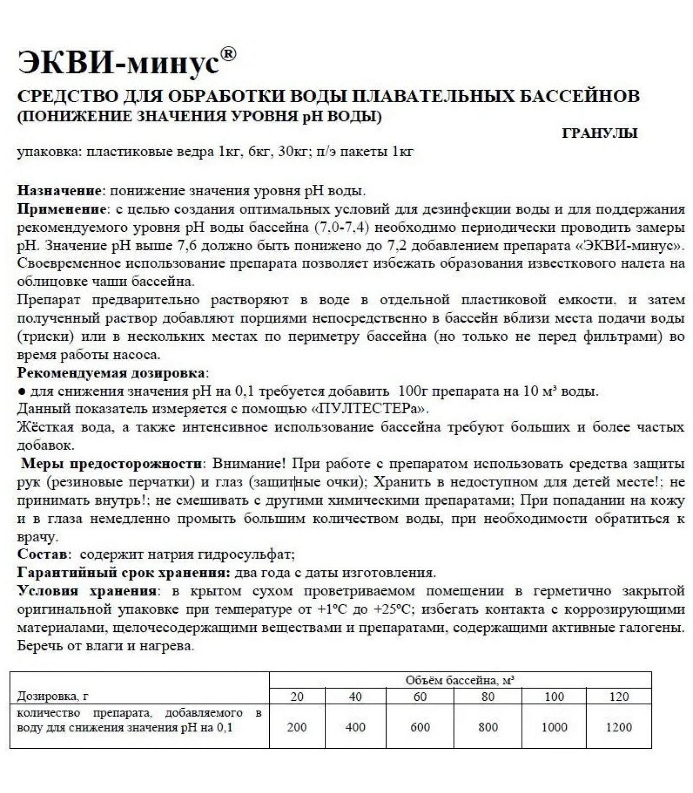 Рекомендуемая дозировка: для снижения значения рН на 0,1 требуется добавить 100 г препарата на 10 куб м воды.
