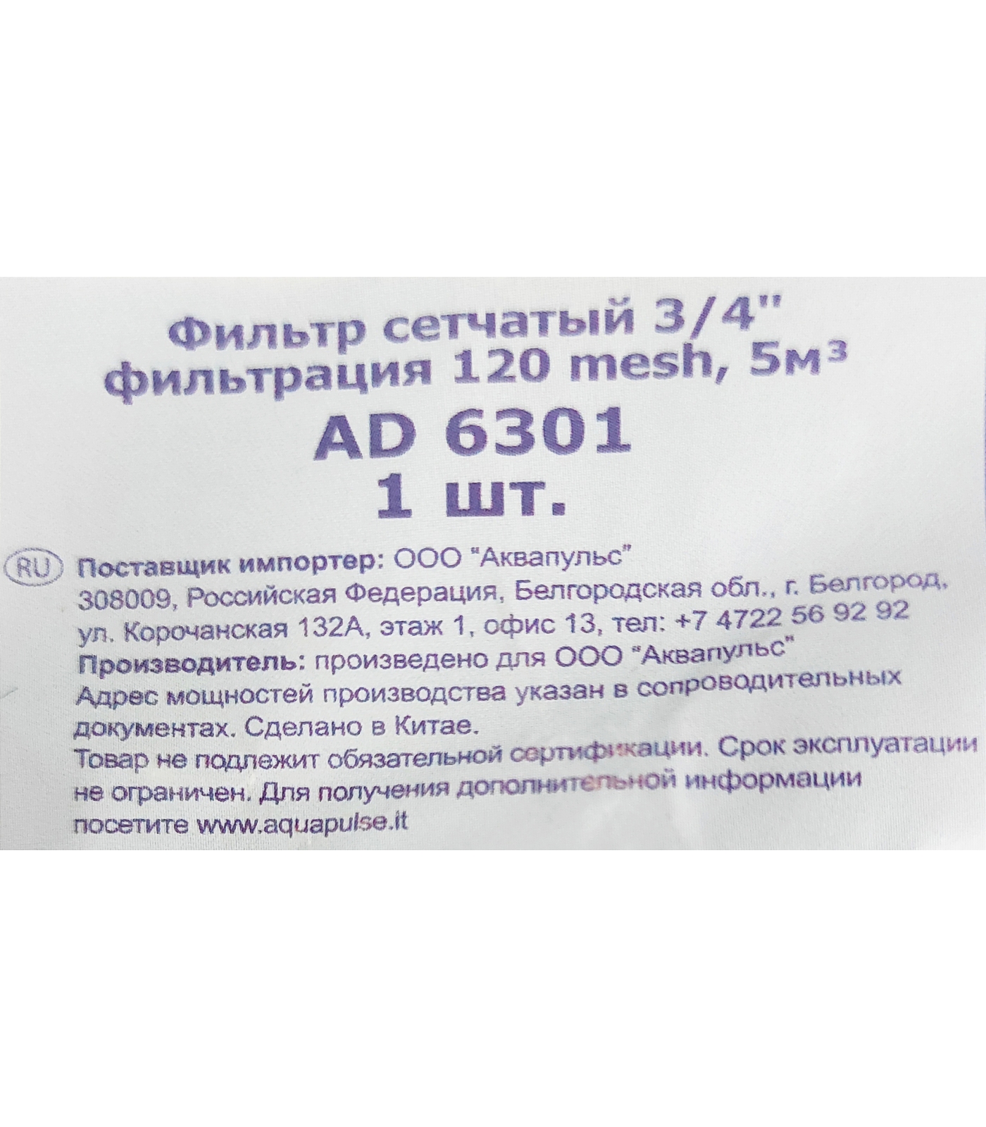 Aquapulse AD 6301 Фильтр сетчатый с наружной резьбой 3/4''