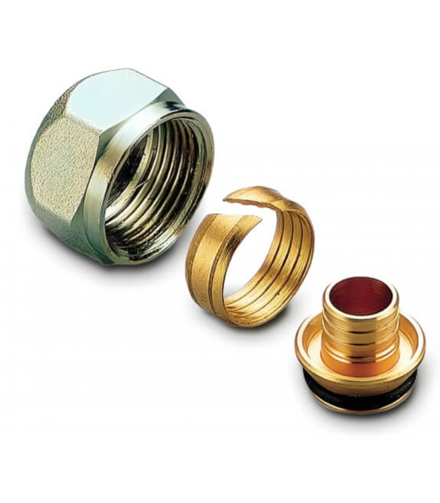 Евроконус состоит из трех элементов: штуцер с уплотнительными прокладками, обжимное кольцо и обжимная гайка с внутренней резьбой.