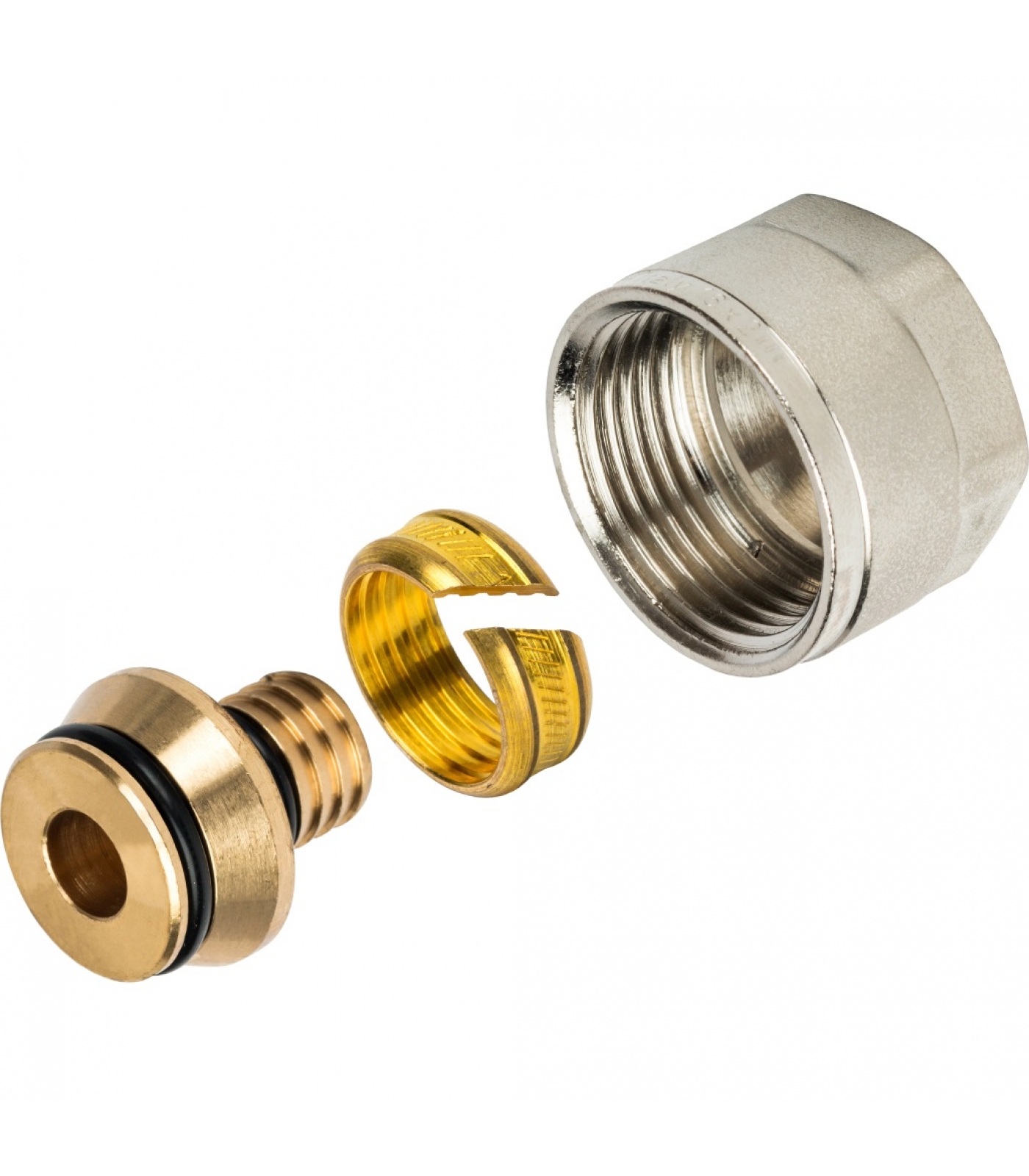При накручивании гайки на выходной элемент соединяемого с трубой распределительного коллектора разрезное кольцо стягивается, обжимая трубу на штуцере фитинга.
