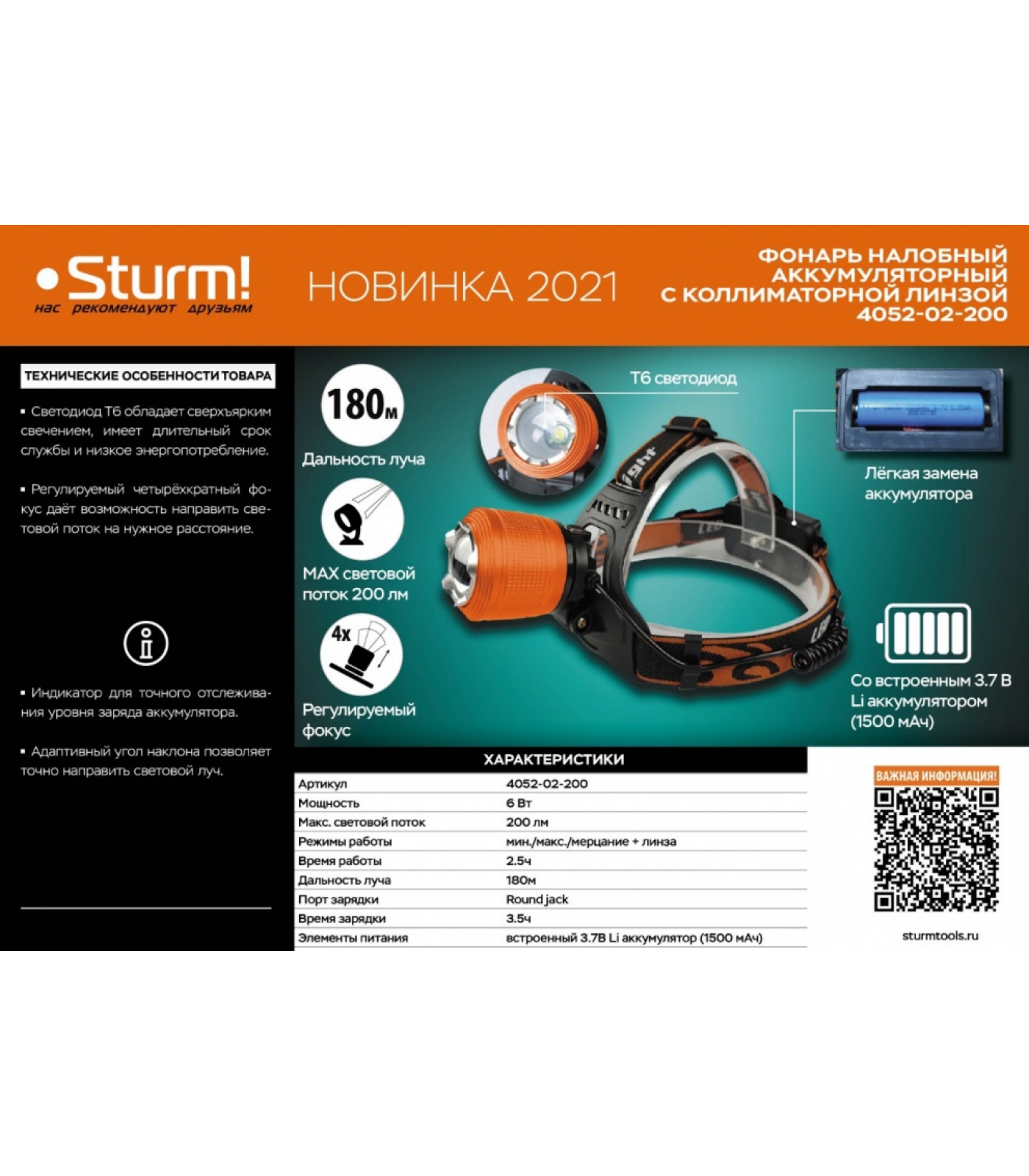 Фонарь налобный аккумуляторный, T6 светодиод, функция зум, 3 режима, 200лм Sturm!