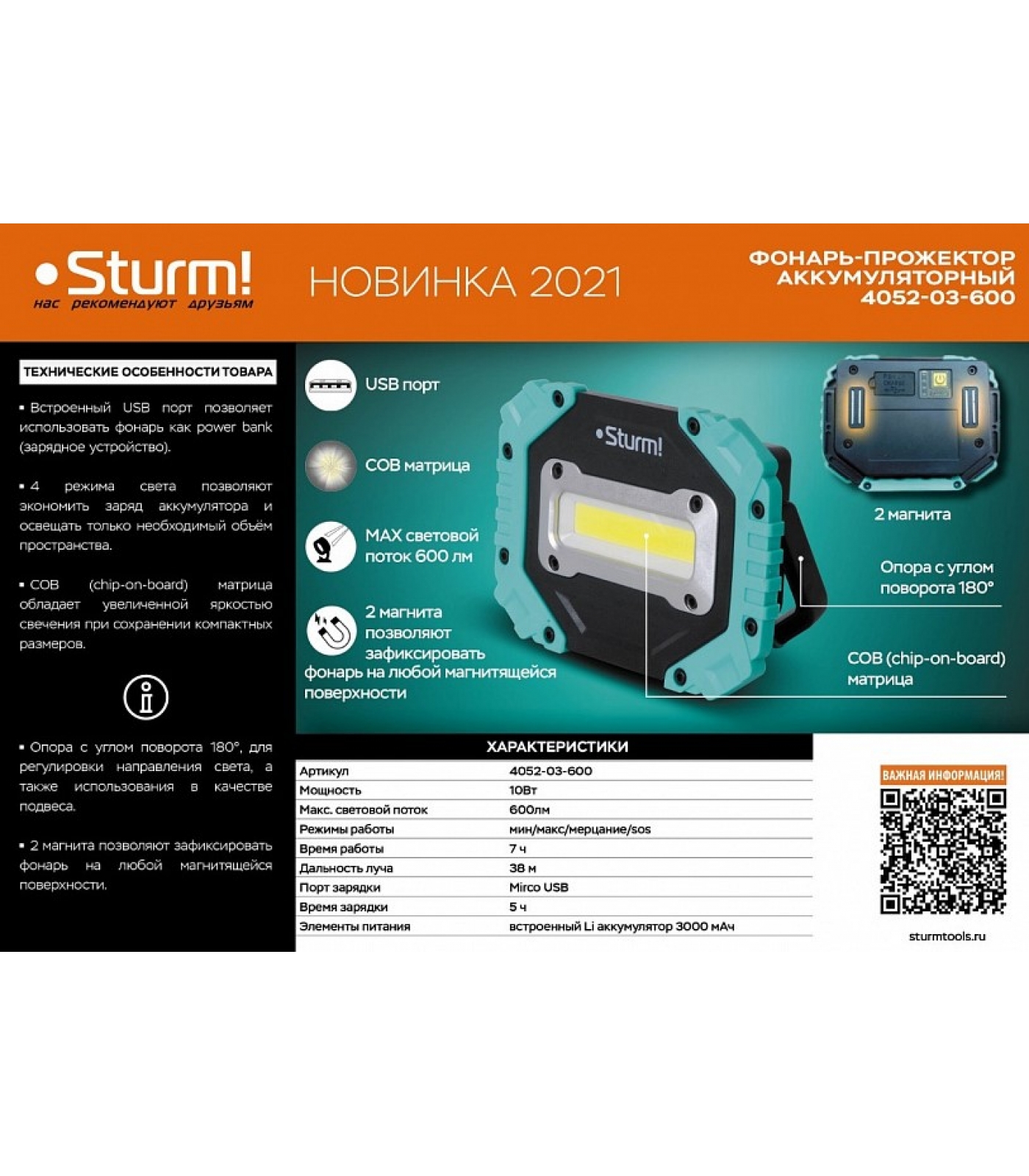 Фонарь-прожектор, COB, 4 режима, 600лм, поворотная опора, усиленный корпус, Sturm!