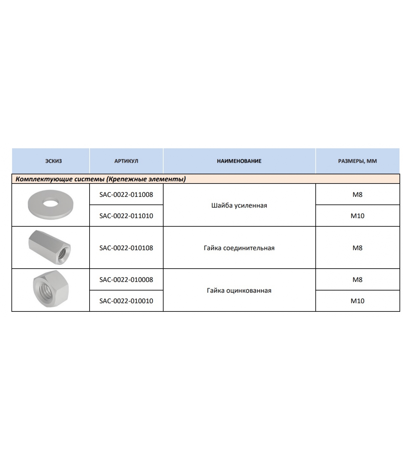 Крепежные изделия (болты, гайки, шайбы, саморезы) предназначены для соединения отдельных элементов в единую систему и удержания в несущей конструкции. Широко применяются в промышленности и строительстве в связке с различными элементами монтажных систем. Обеспечивают быстрое и надежное крепление, выдерживают высокие нагрузки, устойчивы к коррозии благодаря обработке цинком.