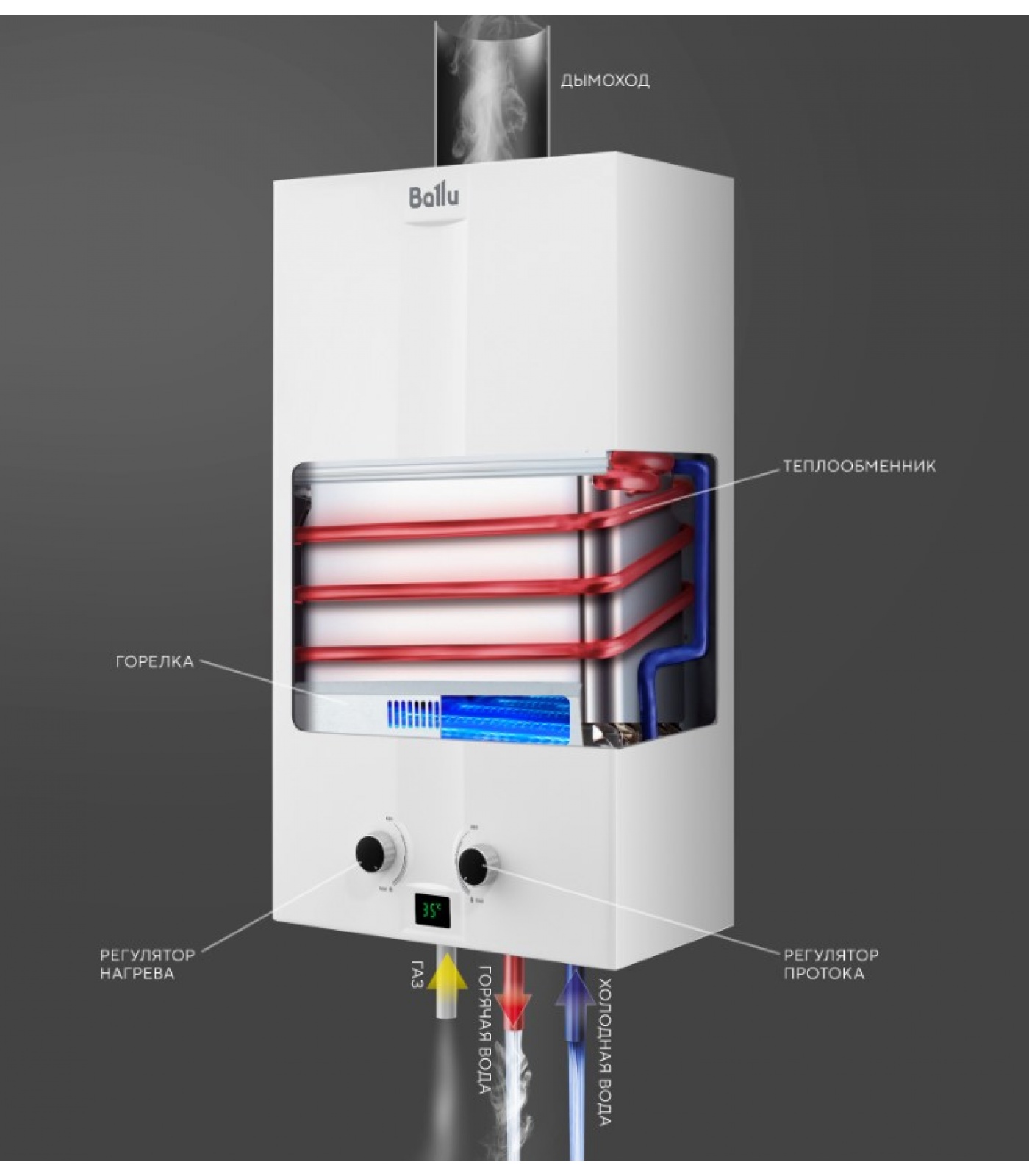 Теплообменник газовых колонок Ballu создан из высококачественной меди с надежным защитным покрытием, это гарантируют надежную бесперебойную работу прибора.