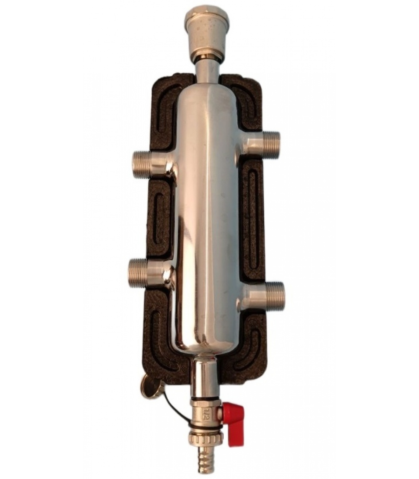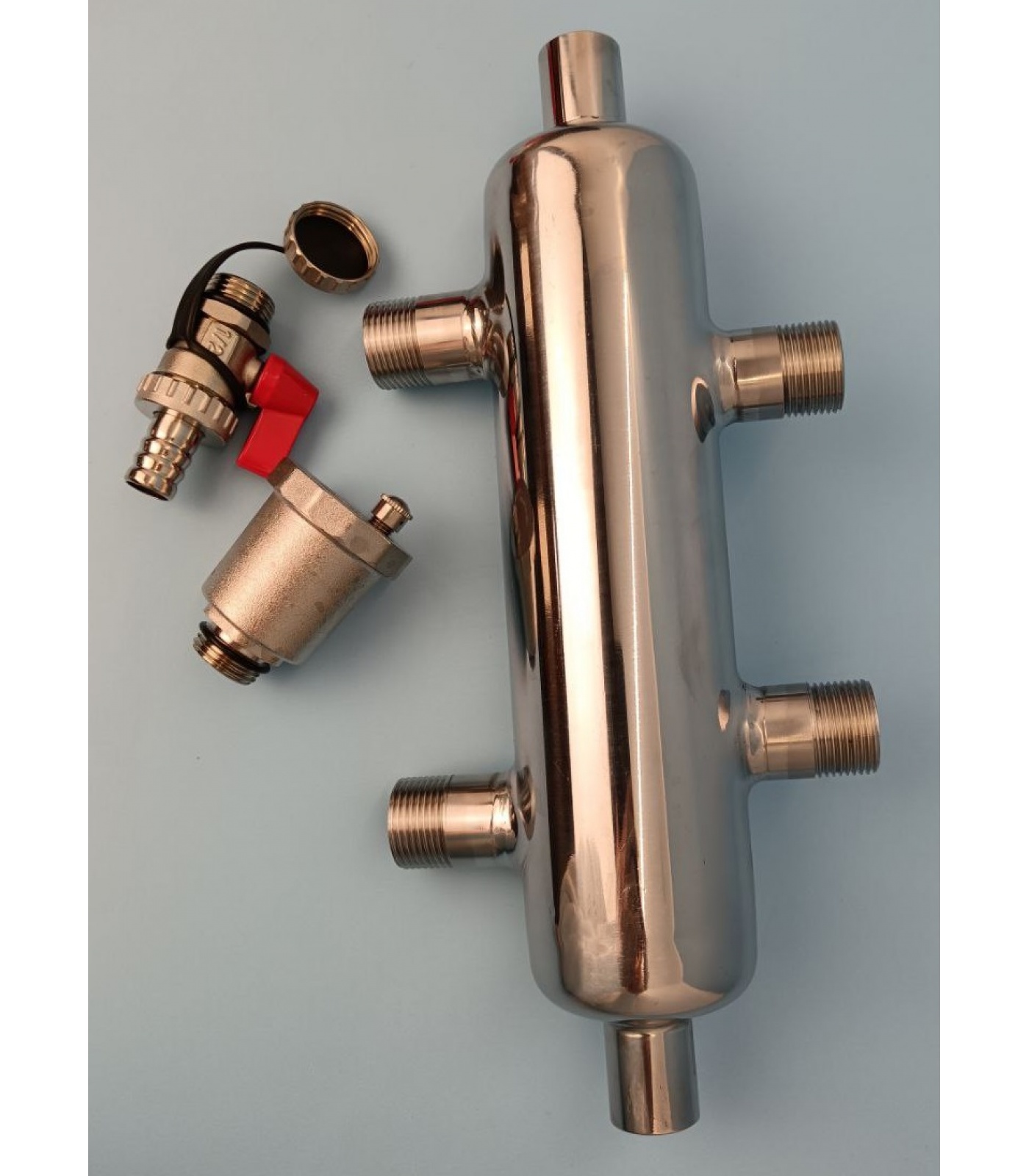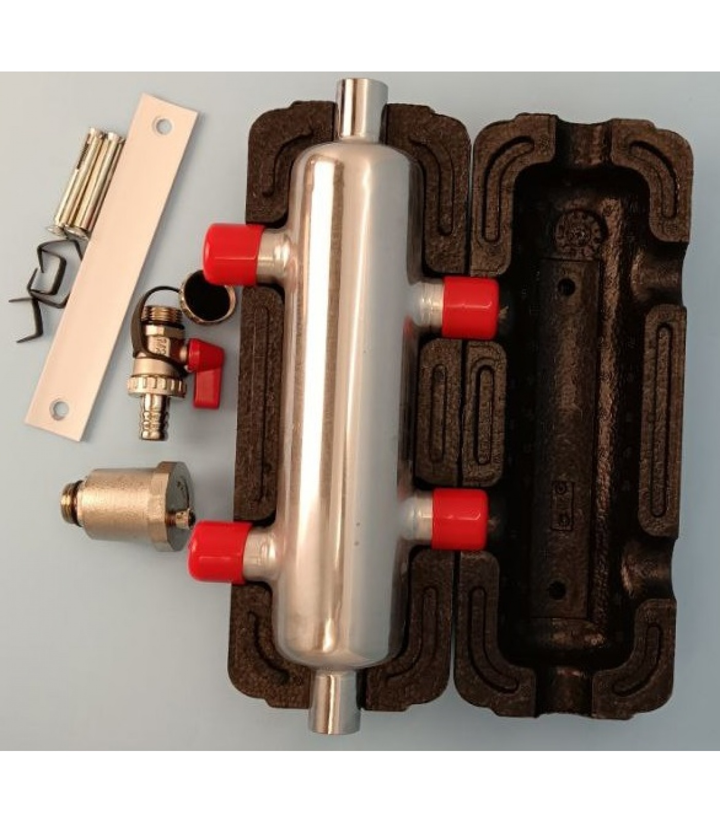 Основная функция заключается в гидравлическом разделении первичного контура, идущего от отопительного котла, и вторичных контуров циркуляции, которые распределяют отопительные ветви с переменным расходом.
