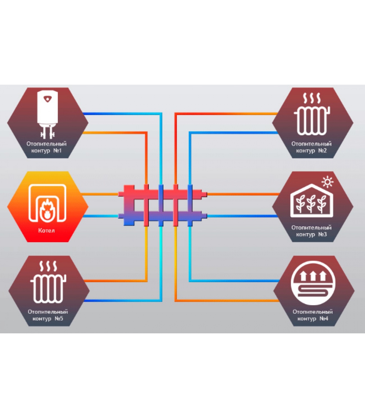Гидравлический разделитель с коллектором Север R-M5 Aisi горизонтальный до 70 кВт, 5 контуров, сталь нержавеющая