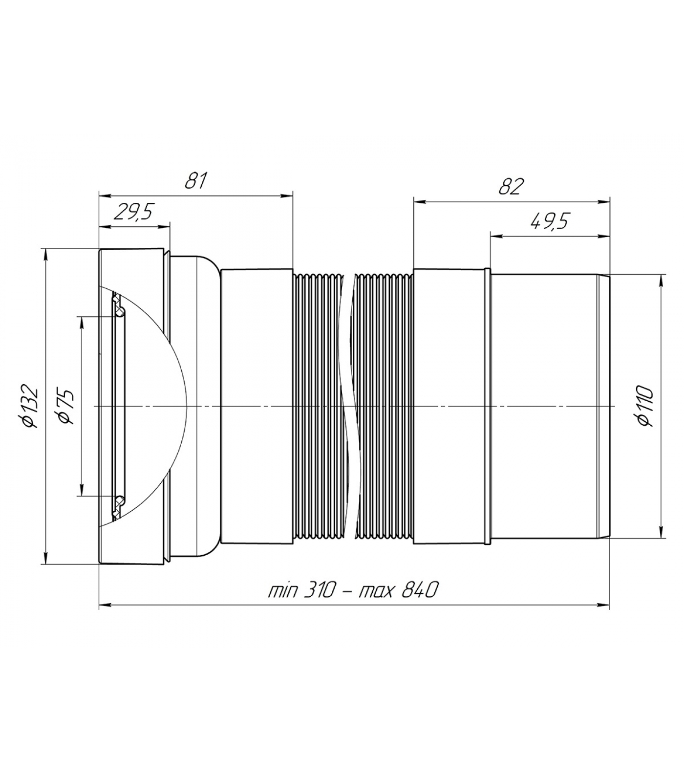 Длина трубы 310-840мм, присоединение к унитазу через EPDM муфту (каучук, сохраняющий отличную эластичность в широких температурных режимах, устойчивый к химическим воздействиям), выход на канализацию 110 мм. Для пластиковых труб канализации. Удлинители гибкие выполняют функцию фановых труб и предназначены для соединения унитаза с канализационной трубой. Основное преимущество в том, что они легко монтируются и нет необходимости заранее замерять угол и расстояние (как в случае с фановыми трубами).