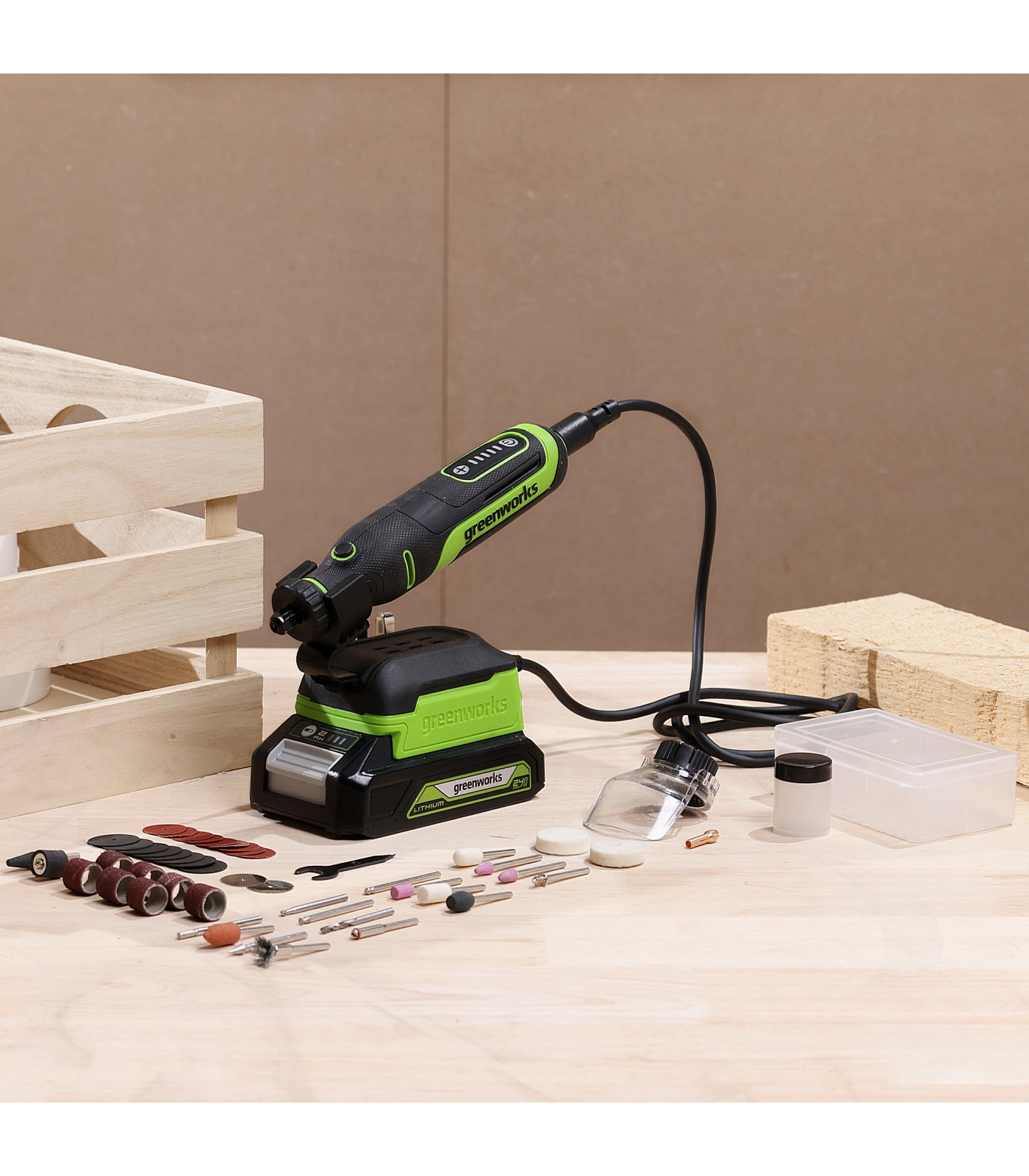 Greenworks G24RT — это универсальный инструмент, которые может использоваться для обработки керамики, фарфора, пластика, металла, стекла, стали, алюминия, ракушек, латуни, эпоксидной смолы, кокоса, нефрита, камня, пластилина, ореха, кости, дерева и т. д.