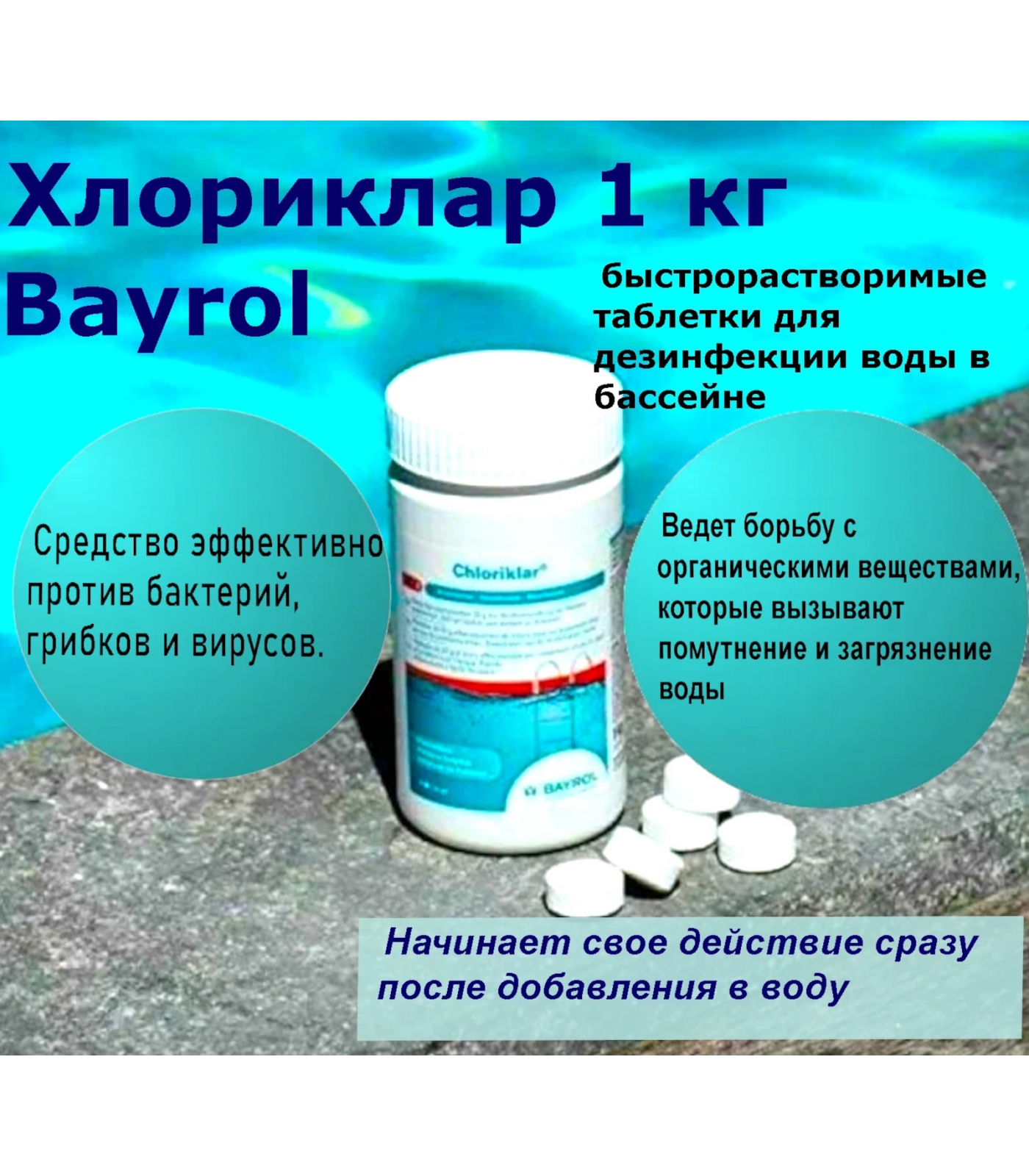 Хлориклар (Chloriklar) - быстрорастворимые таблетки для дезинфекции воды в бассейне, начинающие свое действие сразу после добавления в воду. Упаковка: пластиковая туба, 1 кг. Форма выпуска: хлорсодержащие таблетки.