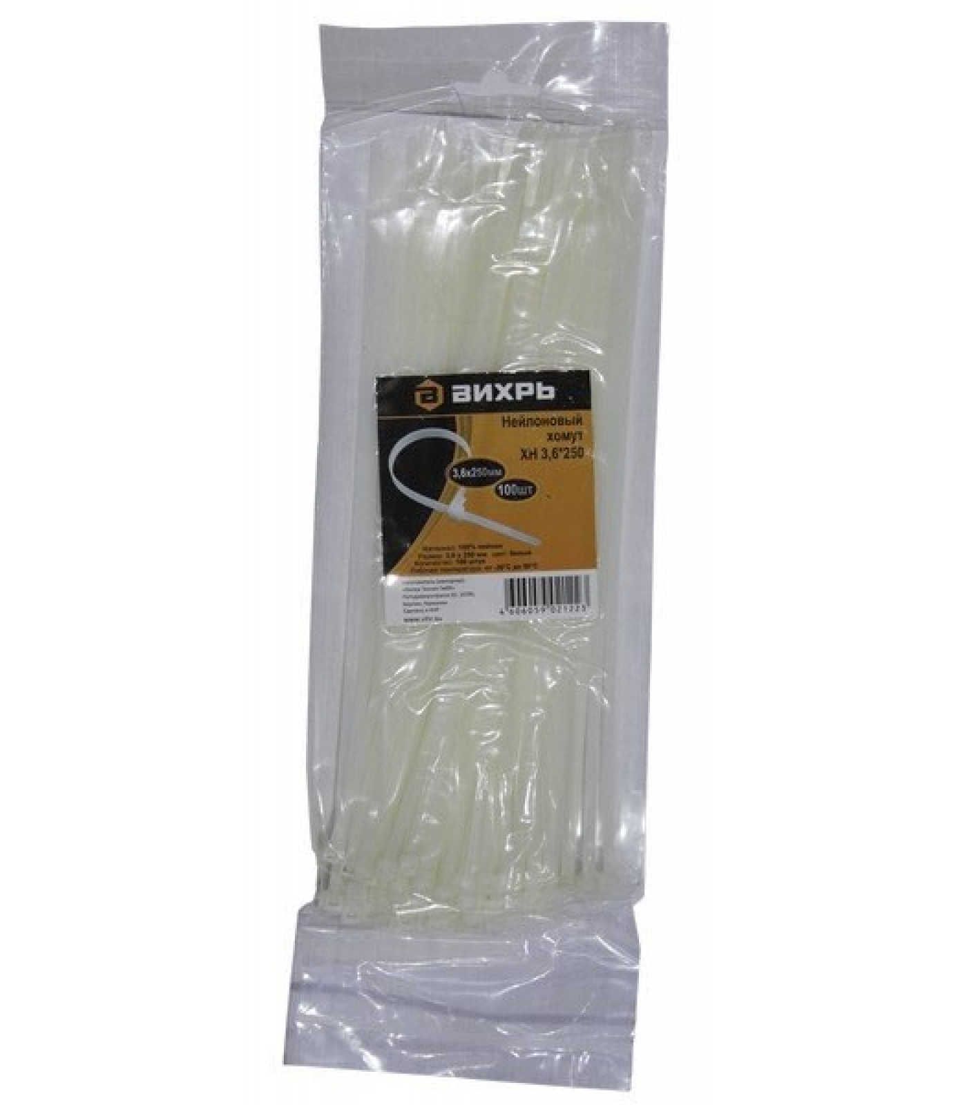Хомут нейлоновый «Вихрь» (стяжка) 3,6*250мм — соединительный элемент, применяется для крепления и фиксации различных конструкций, систем монтажа, электропроводки и многого другого. Может использоваться при маркировке электромонтажных кабелей, так как хомут одновременно выполняет функции крепежного изделия и стяжки для электропроводов. Хомуты являются достаточно быстрым и удобным способом крепления и бандажирования, также их можно использовать как в помещении, так и за его границами.