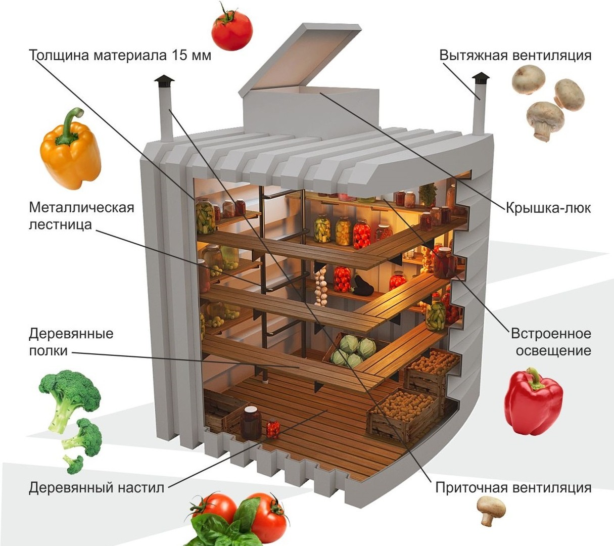 Организация хранения продуктов – вопрос, актуальный для всех владельцев загородных и дачных домов. Погреб пластиковый для дачи – достойная альтернатива традиционным хранилищам из бетона или кирпича. Конструкция выполнена в форме короба со стеллажам и дополнительно укреплена ребрами жесткости. Торговая марка Тингард комплектует погреба из пластика лестницами, системой освещения и герметичной крышкой.