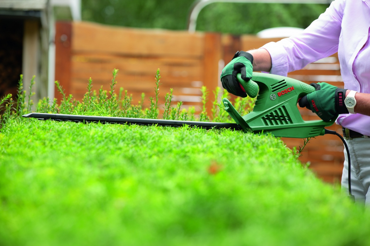 Электрические кусторезы идеально подойдут для работы на участках площадью от двух до семи соток. Такие приборы отличаются низким уровнем шума и высокой степенью надежности. Однако работа с электроинструментом всегда будет ограничена длиной провода, поэтому на больших площадях использование электроинструмента не является целесообразным.