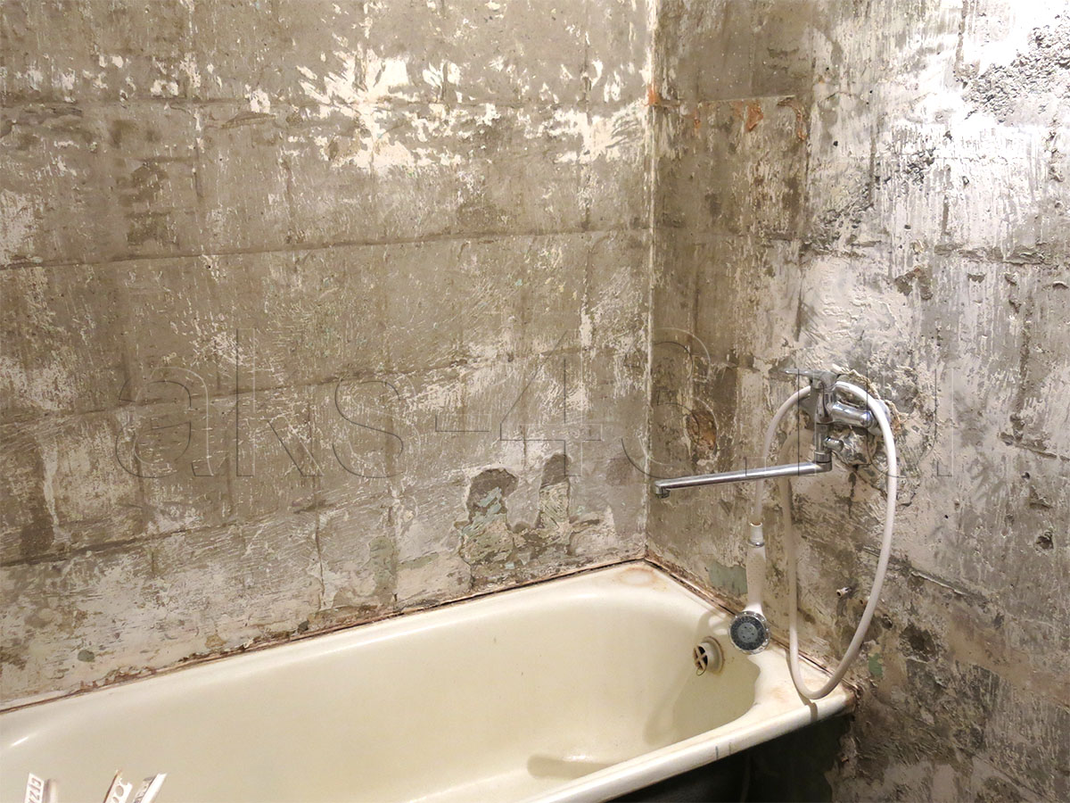 Все поверхности зачищаются от старого покрытия начиная с потолка. Для этого используется перфоратор, которым нужно удалить всё до основания. Себя нужно защищать от пыли респиратором и маской. В панельном доме иногда можно найти под кафелем утепление из ГВЛ. Делая ремонт ванной, его нужно полностью убрать, поскольку обрешетка, вероятно, прогнила насквозь. Можно найти вещи похуже, вплоть до черной плесени. Должны получиться ровные чистые стены, которые нужно проверить уровнем.