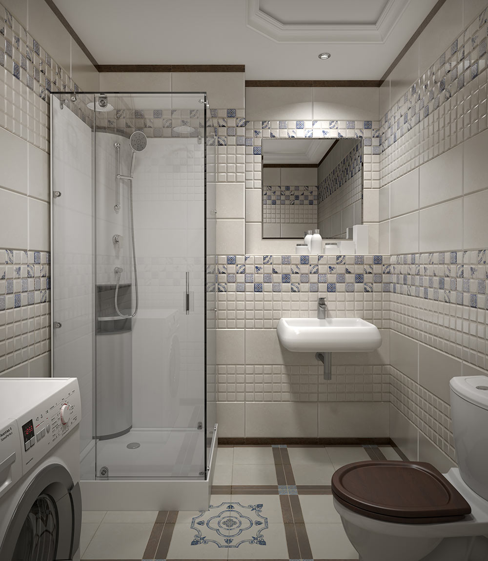 Между плитками на поверхности всех м2 стен санузла нужно вставлять крестики для выдерживания одинакового размера швов. В местах, где будут выведены трубы, нужно заранее просверлить отверстия нужного диаметра. Углы нужно залить силиконовым герметиком.