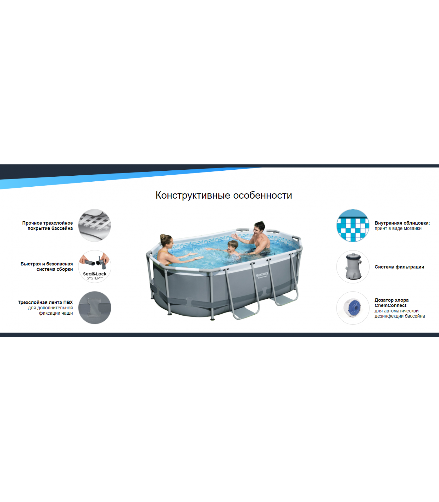 В комплекте с бассейном поставляется сменный картридж для фильтра, фильтрационная установка и встроенный дозатор, которые гарантируют поддержку чистоты воды на протяжении всего сезона купания..